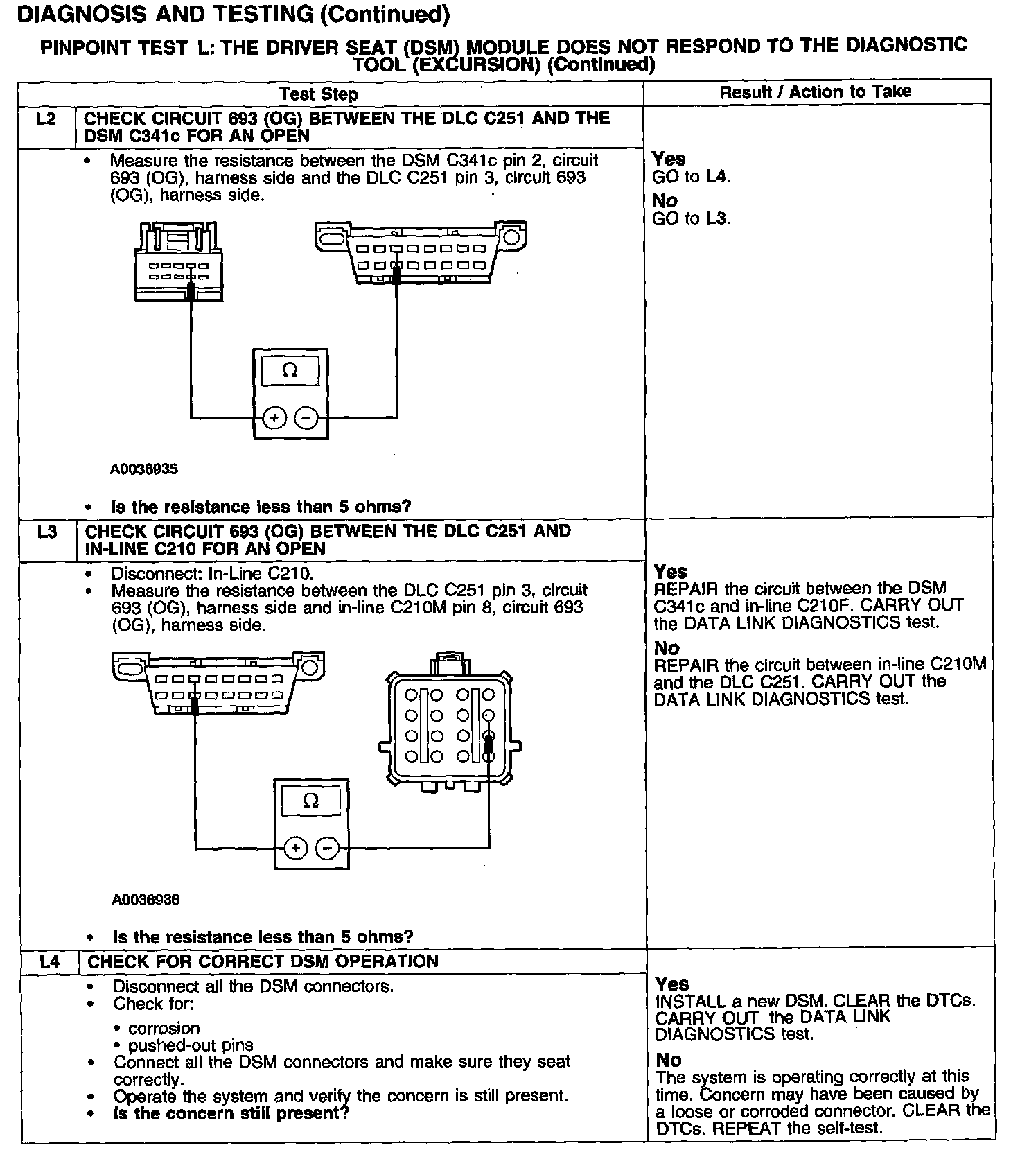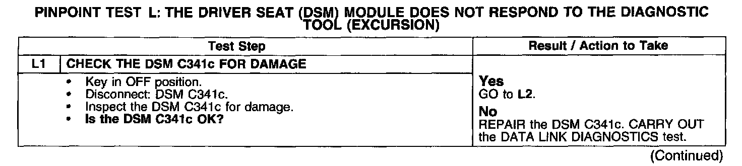 PINPOINT TEST L: THE DRIVER SEAT (DSM) MODULE DOES NOT RESPOND TO THE DIAGNOSTIC TOOL (EXCURSION)