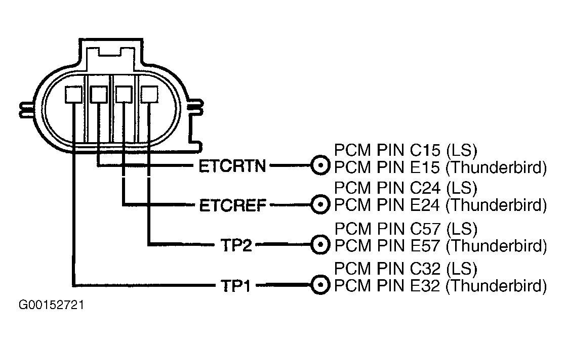 Disconnect ETC TP harness connector. Turn ignition switch to ON position. Measure voltage between ETCREF and ETCRTN pins at the ETC TP sensor harness connector. See Figure . Is the voltage between 4.0 and 6.0 volts? If yes, go to next step. For P0122, go to step 4). If no, go to TEST C, step 1) . - 4) For KOEO, KOER & Continuous Memory DTC P0223 & P2135: Check TP Sensor Harness For Open Circuit