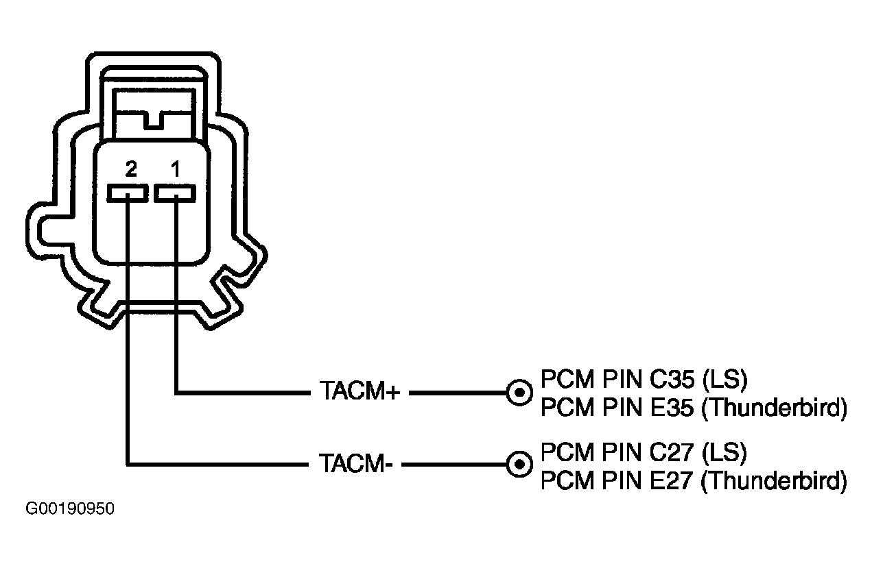 Measure the resistance between the TACM (+) pin and TACM(-) pin. See Figure. Is the resistance greater than 10 k/ohms? If yes, go to next step. If no, properly wire the TACM per TACM and PCM connector diagrams.