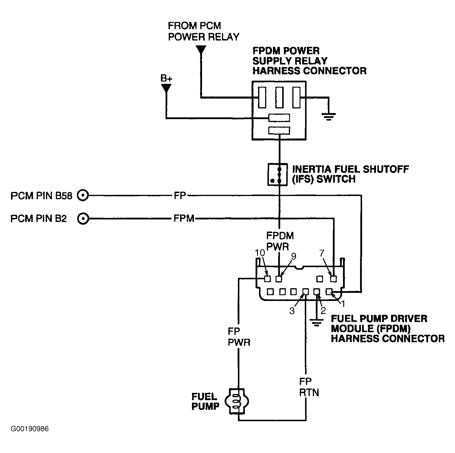 Turn ignition switch to OFF position. Disconnect FPDM connector. Disconnect PCM connector(s). Inspect connector for loose, damaged or corroded terminals. Repair as necessary. Using a DVOM, measure resistance of FP circuit between PCM harness connector and FPDM harness connector (REM on LS and Thunderbird). See Figure-Figure . If resistance is less than 5 ohms, go to next step. If resistance is 5 ohms or more, repair open in FP circuit.