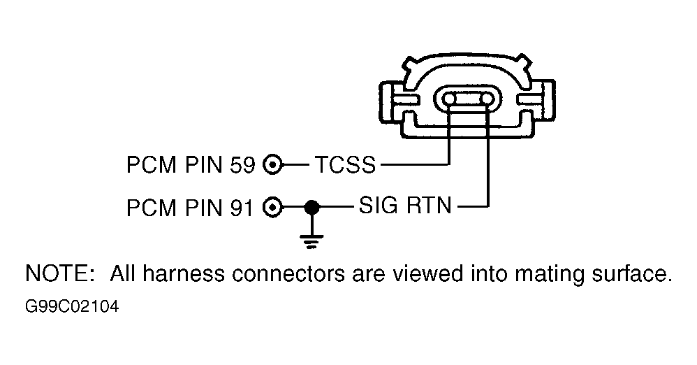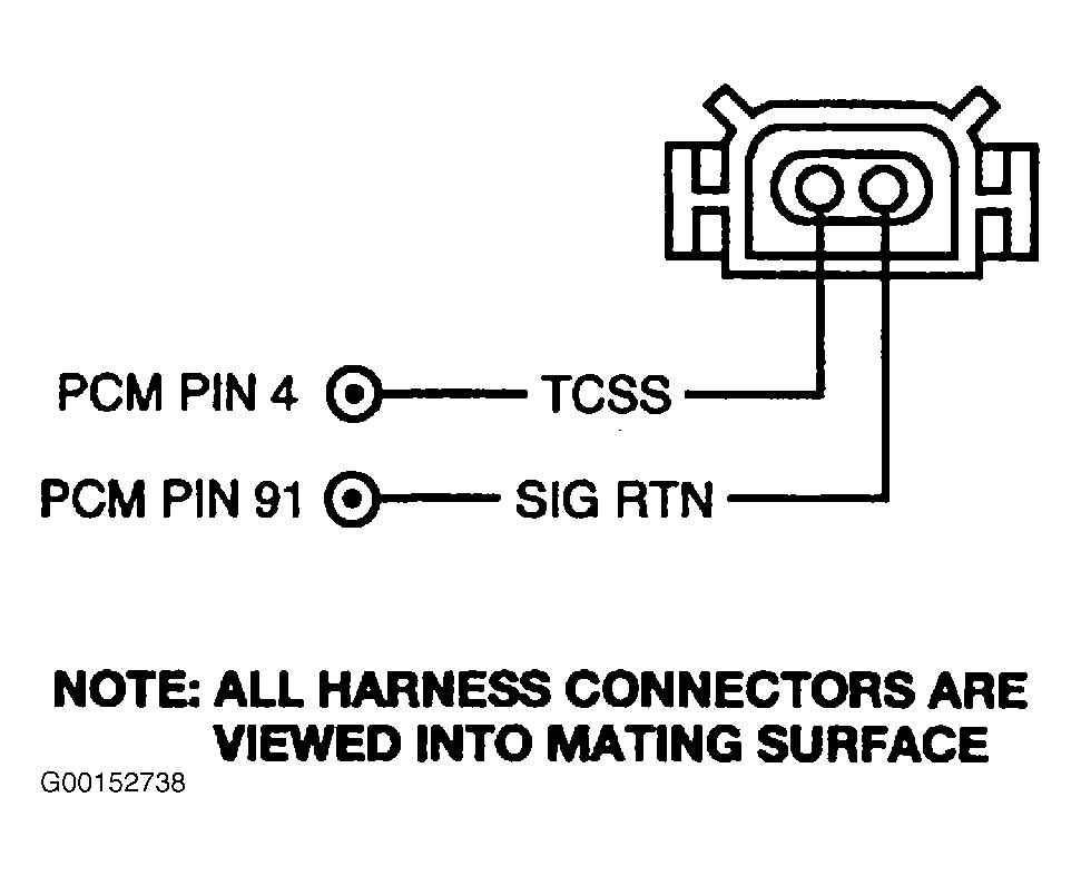 Using a DVOM, measure resistance between TCSS SIG circuit, TCSS SIG RTN circuit and chassis ground at TCSS harness connector. See Fig 1 or Fig 2 . If both resistance measurements are more than 10 k/ohms, replace PCM. If either resistance measurement is 10 k/ohms or less, repair short to ground in TCSS SIG circuit.