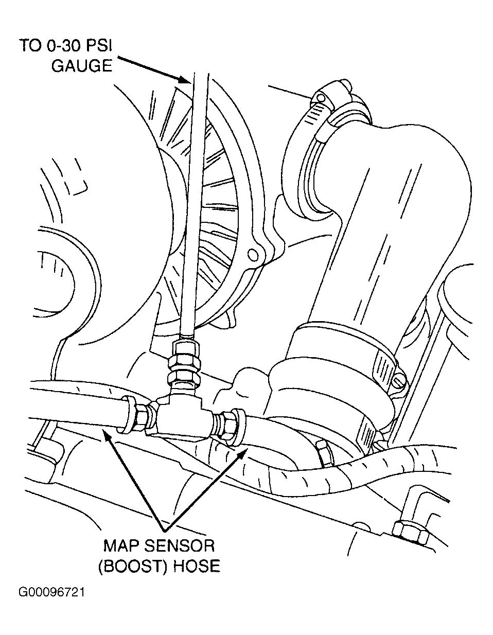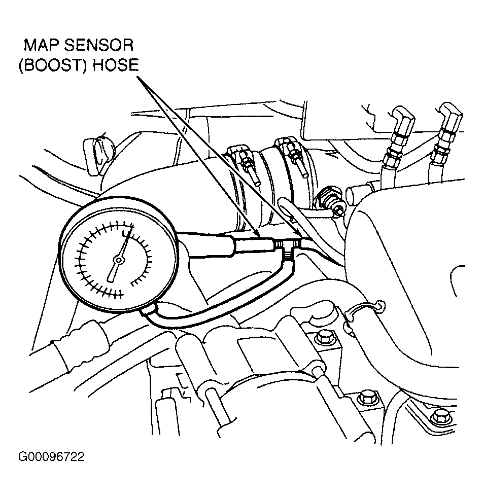 1. Ensure engine is at normal operating temperature. Disconnect MAP sensor hose at intake manifold. Install a "T" fitting between MAP sensor hose and hose nipple at manifold. Connect a 0-30 psi (0-207 kPa) gauge to "T" fitting. Ensure MAP sensor is connected for this test and that hose is long enough so gauge can be put inside cab of vehicle. See Fig 1 or Fig 2 .