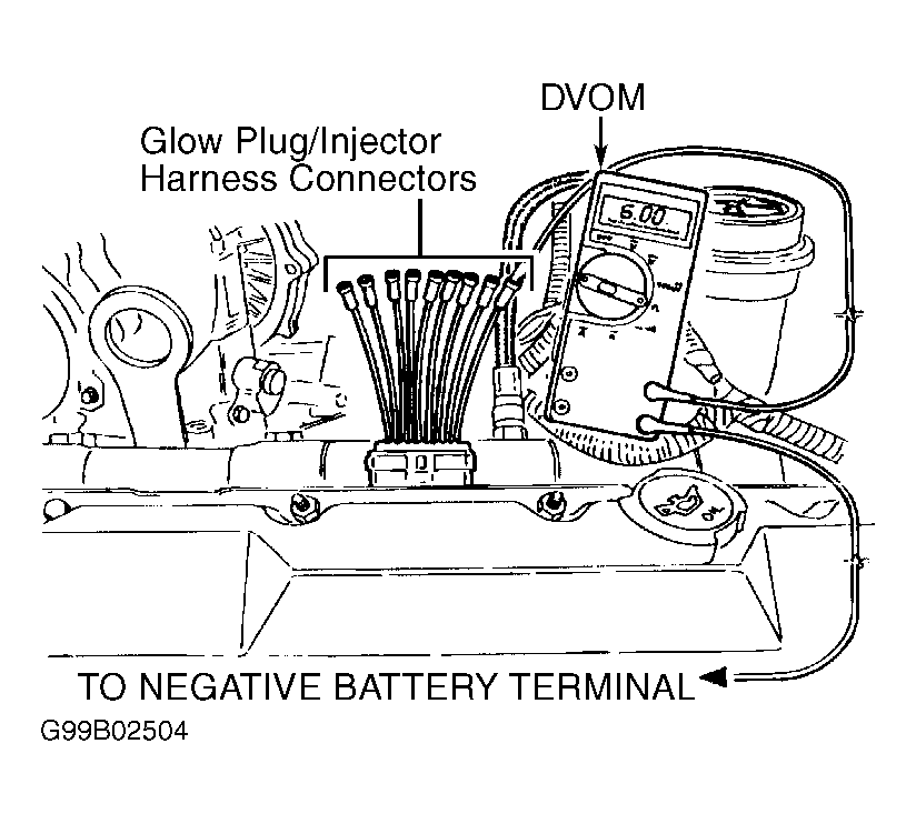 3. Turn ignition off. Disconnect all 4 glow plug/fuel injector connectors at valve cover gaskets. Install Glow Plug Injector Adapter (014-00935) to any injector connector at valve cover gasket. See Fig 2. Using DVOM, measure resistance between negative battery terminal and each glow plug test point at glow plug injector adapter. If all resistances are .1-2.0 ohms, go to next step. If any resistance is not .1-2.0 ohms, probable cause is an open in Under Valve Cover (UVC) wiring harness or an open glow plug. Repair as necessary.