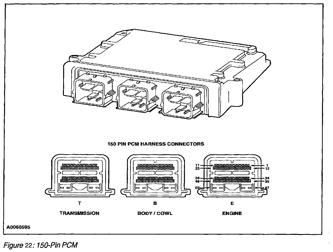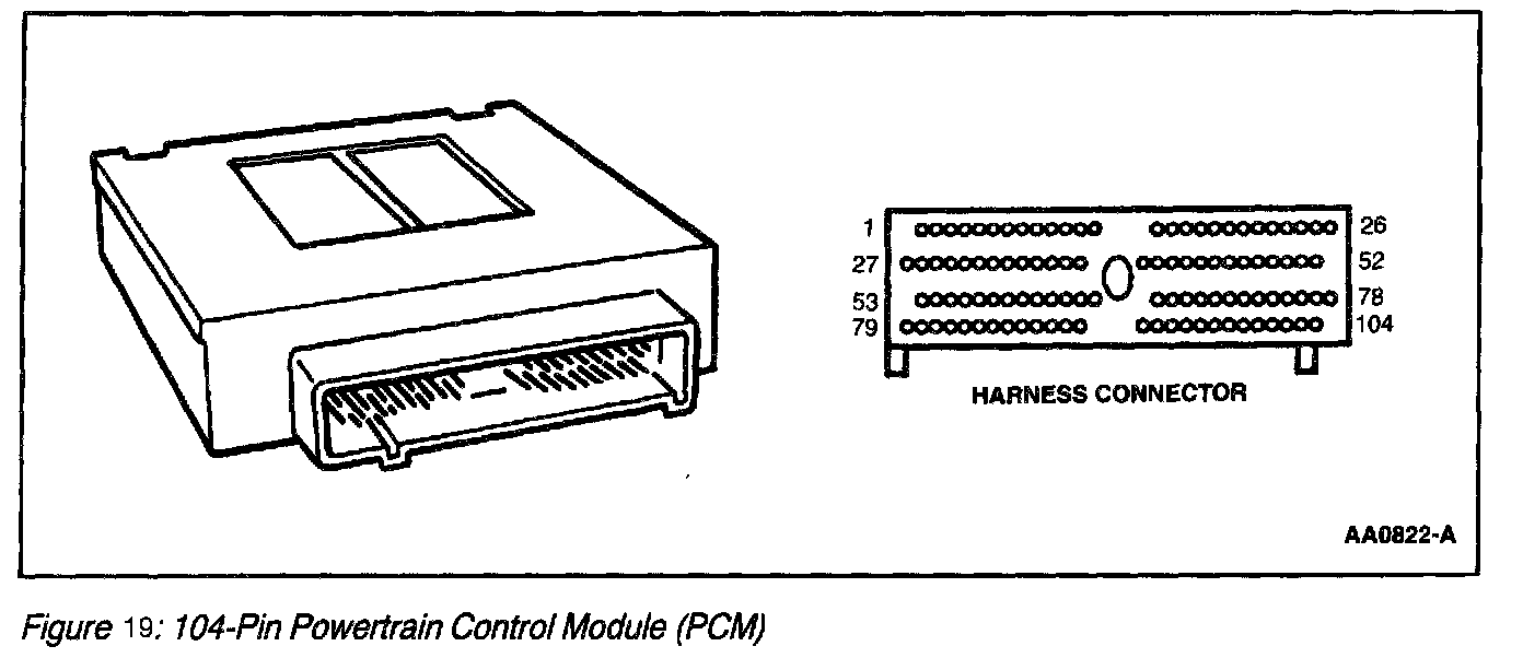 The center of the Electronic EC system is a microprocessor called the Powertrain Control Module (PCM). The PCM receives input from sensors and other electronic components (switches, relays). Based on information received and programmed into its memory, the PCM generates output signals to control various relays, solenoids and actuators. Currently, there are three types of PCM's in use; a 122-pin and 150-pin PCM which has three separate electrical harness connectors and a 104-pin PCM which has one electrical harness connector.