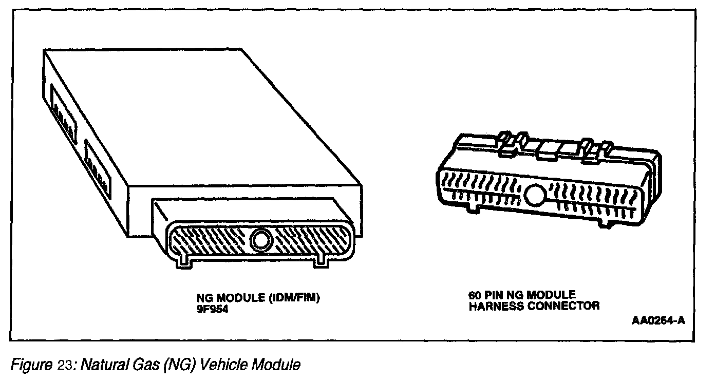 The Natural Gas (NG) vehicle module (Figure 22) provides two functions. The first function operates the fuel injectors and is referred to as the Injector Driver Module (IDM). The second function sends a fuel level indicator signal to drive the fuel gauge and is called the Fuel Indicator Module (FIM). IDM NG vehicle fuel indicator driver signals are based on powertrain control module (PCM) fuel injector driver signals and are controlled directly by the corresponding injector drivers in the PCM. The IDM must be used to provide the NG fuel injectors with the required high current necessary for proper operation. The greater demand of NG fuel injector current warrants an increased size of the injector driver and increased heat dissipation. Given these conditions, the PCM would not be suitable for placement of these drivers. The IDM closely resembles the Electronic Engine Control IV PCM module in appearance.