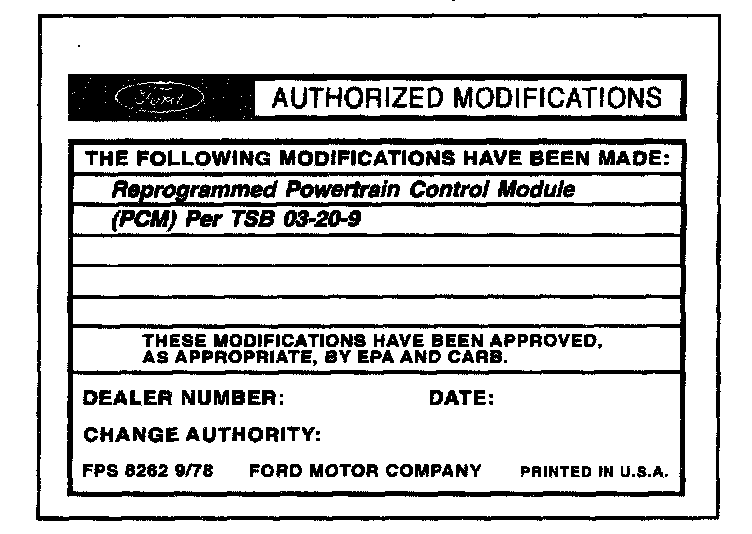 Obtain an Authorized Modifications Decal (FPS 8262 - obtainable through DOES II, 25/pkg) and list the date, dealer number, and summary of modifications performed. Select a prominent place adjacent to the Vehicle Emission Control Information Decal suitable for installing the Authorized Modifications Decal. Clean the area, install the decal, and cover it with a clear plastic decal shield