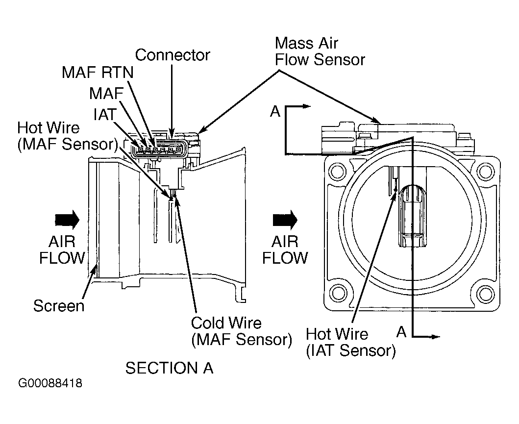 Intake Air Temperature (IAT) sensors and integrated MAF type, are thermistor devices in which resistance changes with temperature. See Fig 1 and Figure . Electrical resistance of a thermistor decreases as temperature increases, and increases as temperature decreases. Varying resistance affects voltage drop across sensor terminals and provides electrical signals to PCM corresponding to temperature. Thermistor type sensors are considered passive sensors. A passive sensor is connected to a voltage divider network so that varying resistance of passive sensor causes a variation in total current flow.