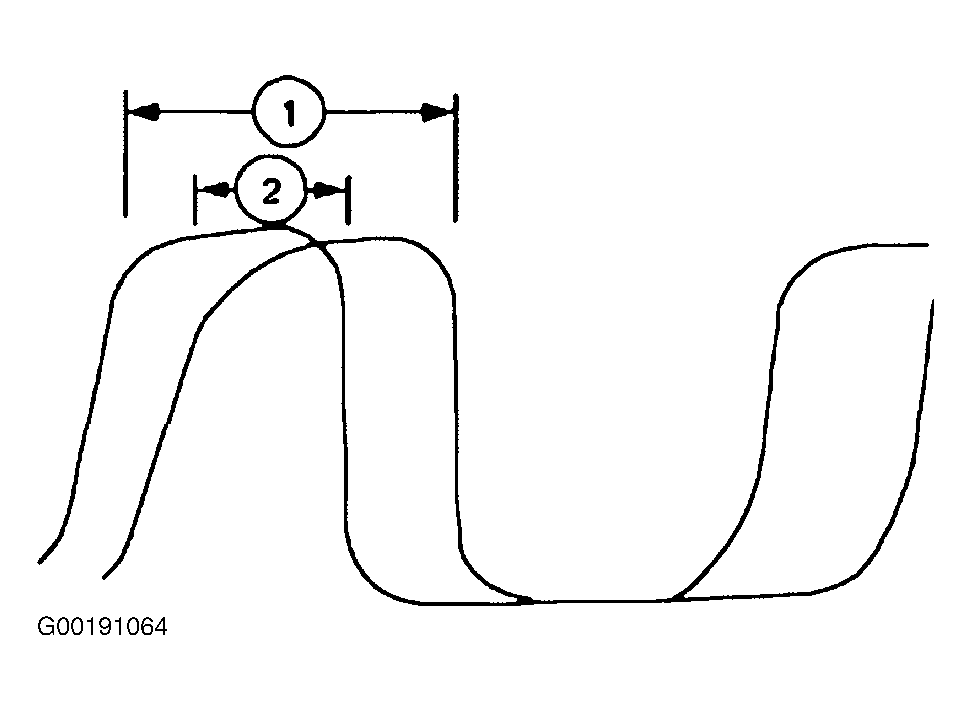- With the engine at idle speed and the transmission gear in the park position, select the NGS GRAPH option. Record ten seconds of data from PCM PIDs O2S11 and O2S21 (1 and 2). Retrieve the recorded data and identify which of the OS2 signals displays the longest high state time (1). See Fig 2.