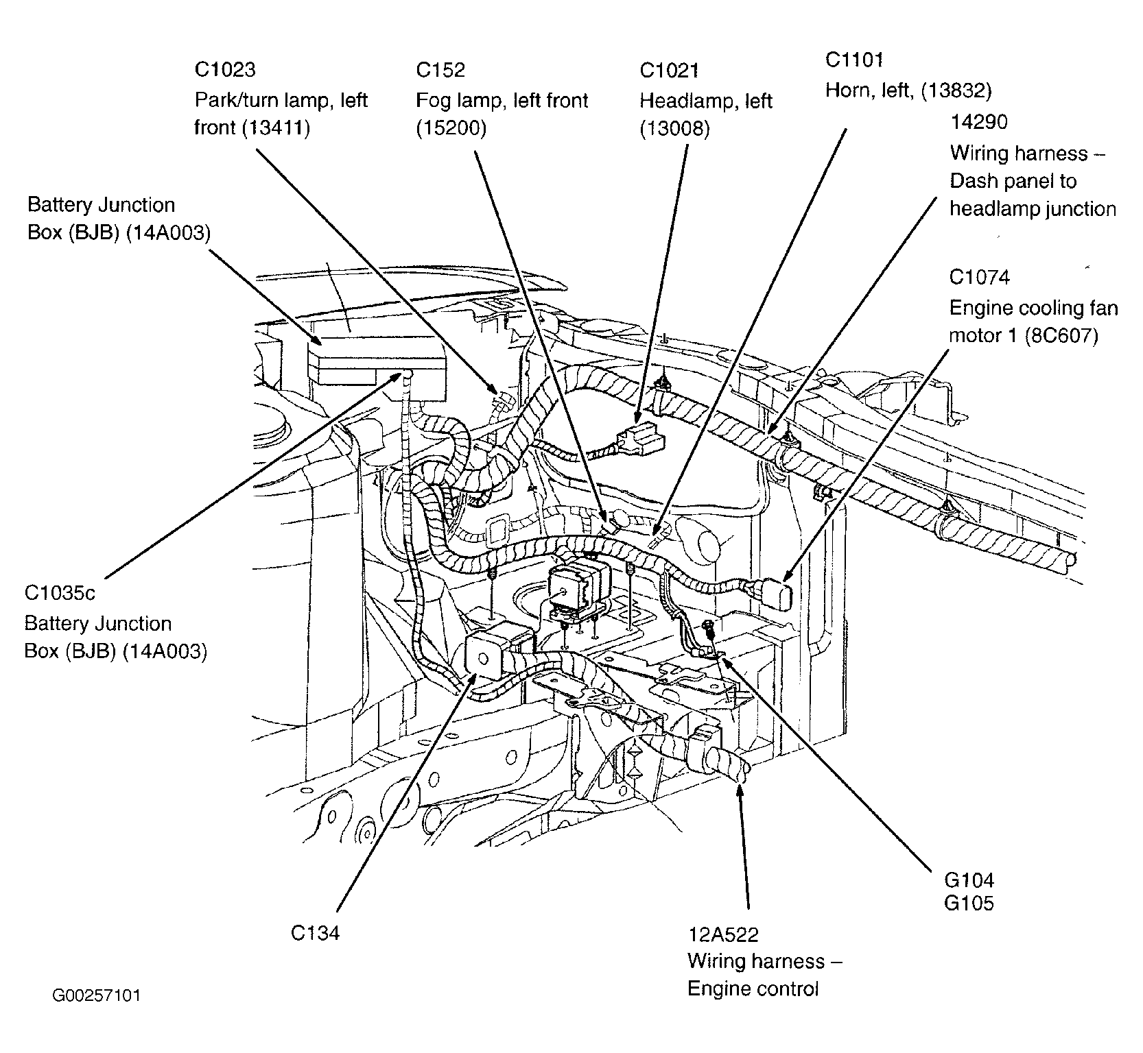 Battery Junction Box (BJB) On left front corner of engine compartment. See Figure .