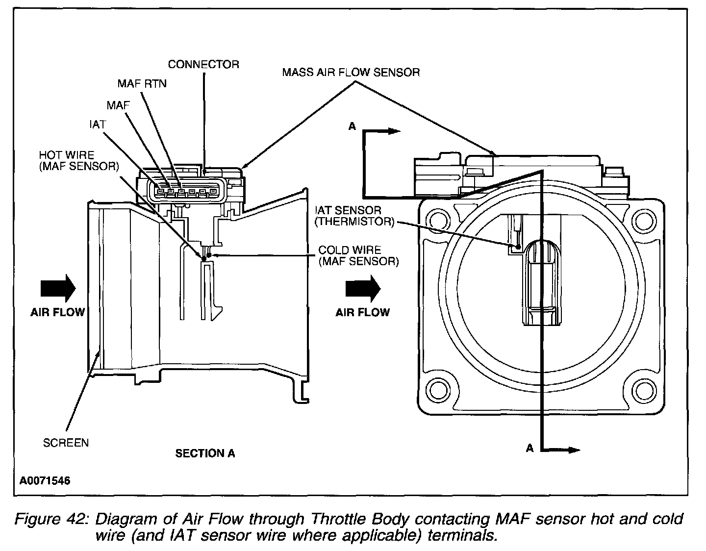 MASS AIR FLOW SENSORDiagram Of Air Flow Through Throttle Body Contacting MAF Sensor Hot And Cold Wire Terminals: