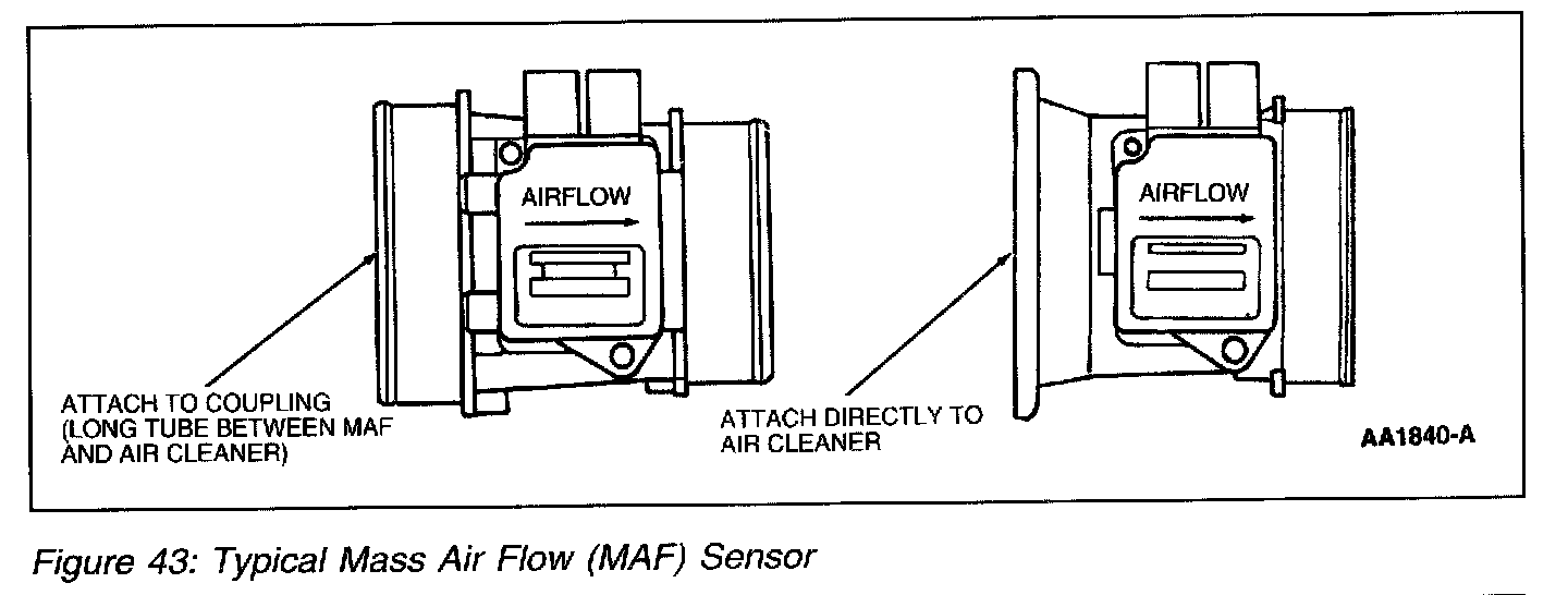 The mass air flow (MAF) sensor uses a hot wire sensing element to measure the amount of air entering the engine. Air passing over the hot wire causes it to cool. This hot wire is maintained at 200°C (392°F) above ambient temperature as measured by a constant cold wire (Figure 42). If the hot wire electronic sensing element must be replaced, then the entire assembly must be replaced. Replacing only the element may change the air flow calibration.