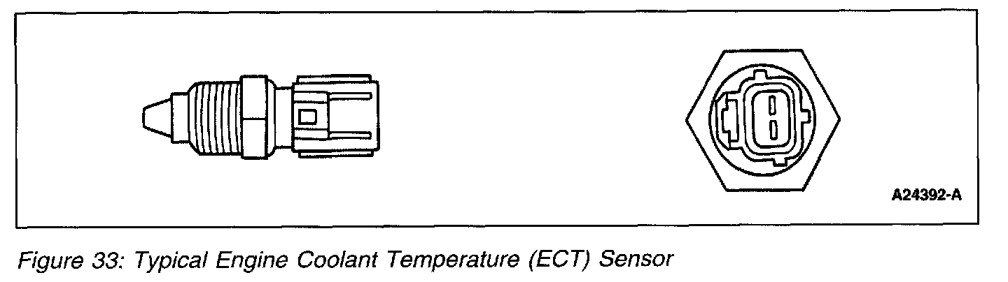 The engine coolant temperature (ECT) sensor (Figure 33) is a thermistor device in which resistance changes with temperature. The electrical resistance of a thermistor decreases as the temperature increases, and increases as the temperature decreases. The varying resistance affects the voltage drop across the sensor terminals and provides electrical signals to the PCM corresponding to temperature.