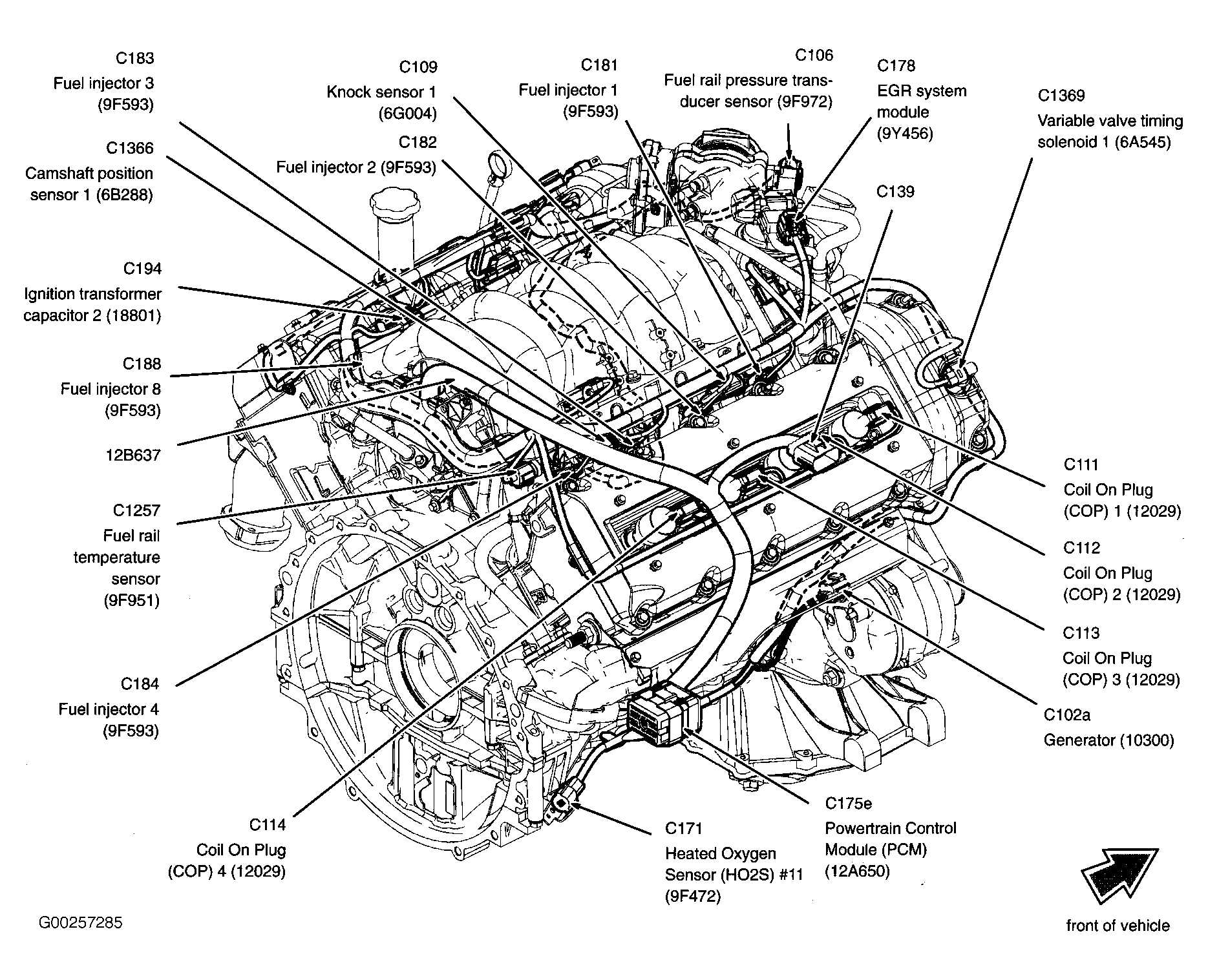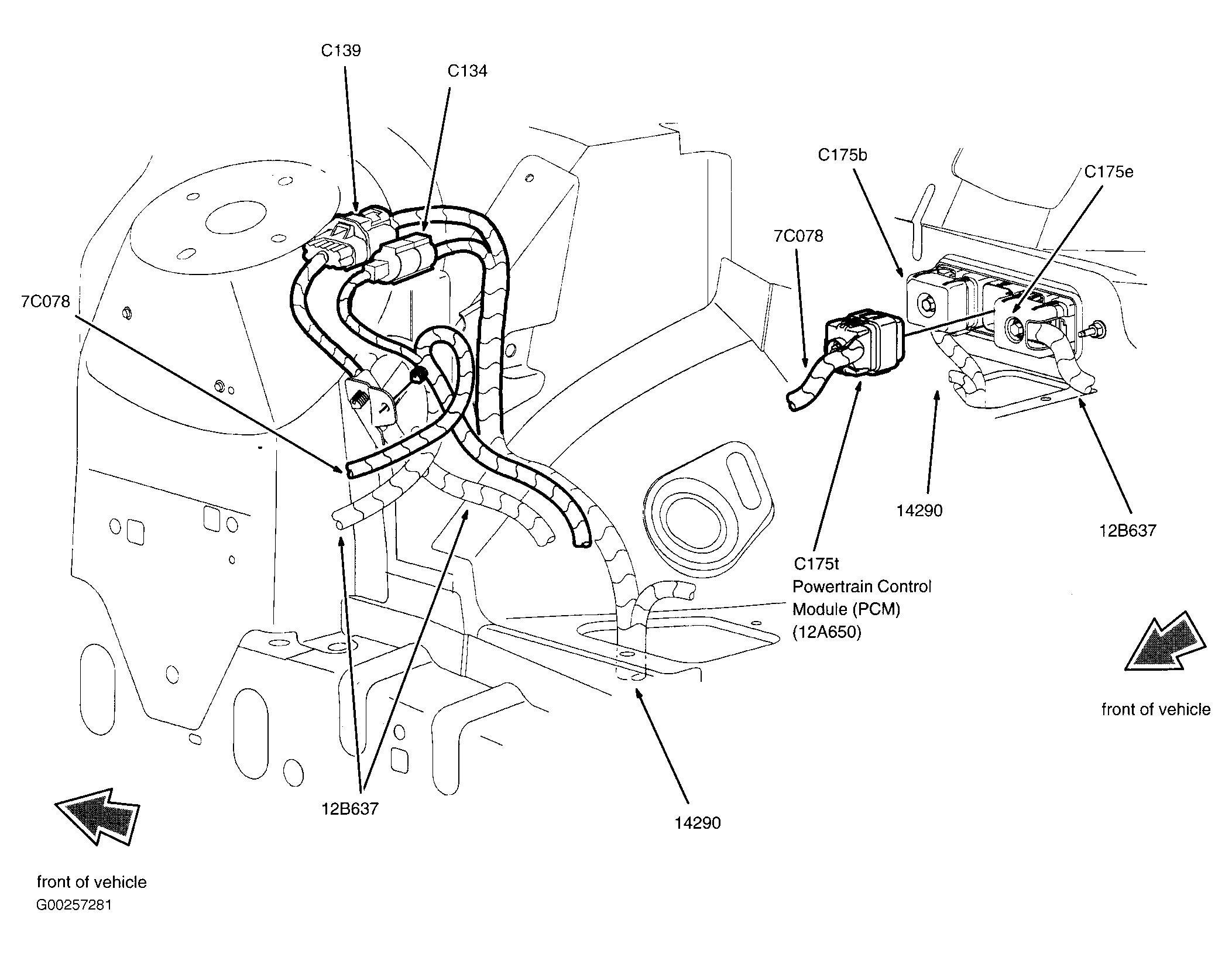 Powertrain Control Module Right rear of engine compartment. See Figure.