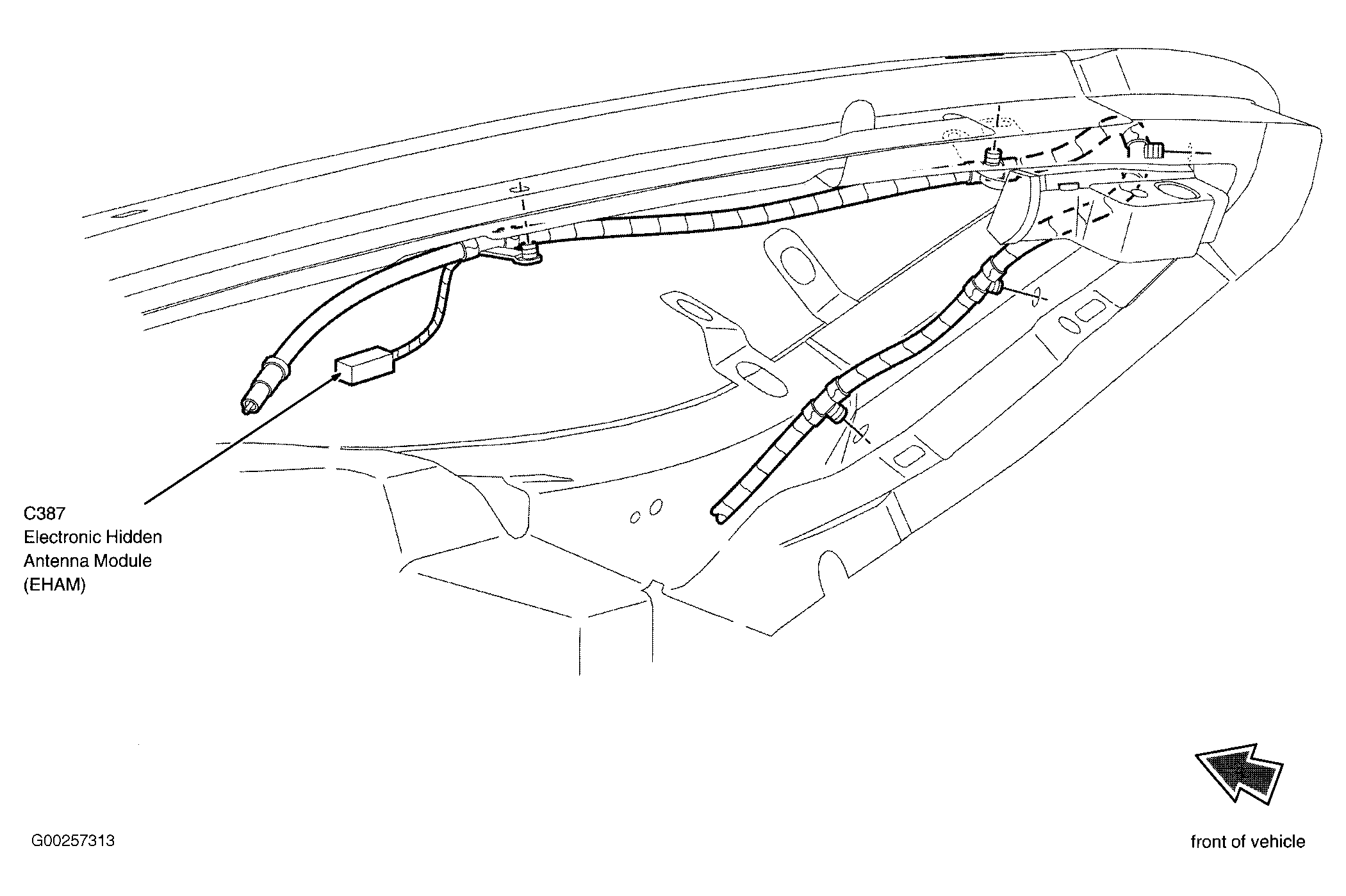 Electronic Hidden Antenna Module In right "A" pillar. See Figure.