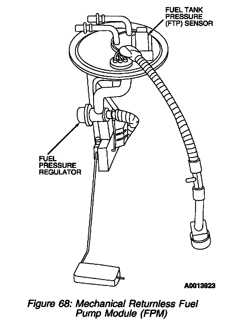 The fuel pump (FP) module is a device that contains the fuel pump and sender assembly. The fuel pump is located inside the FP module reservoir and supplies fuel through the FP module manifold to the engine and FP module jet pump. The jet pump continuously refills the reservoir with fuel, and a check valve located in the manifold outlet maintains system pressure when the fuel pump is not energized. A flapper valve located in the bottom of the reservoir allows fuel to enter the reservoir and prime the fuel pump during the initial fill.