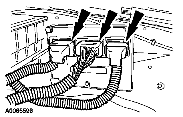 4. Unlatch and disconnect the powertrain control module (PCM) electrical connectors.