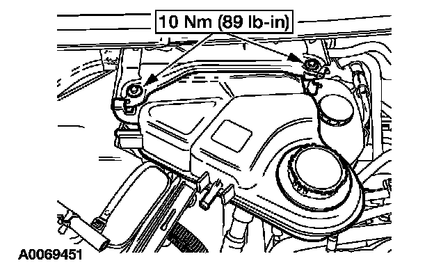 10. NOTICE: With the engine cold, fill vehicles without a yellow fill level decal on the degas bottle only to the MIN line. The correct fill level on these vehicles is between the MIN line and 15 mm (0.59 in) below the MIN line. Fill vehicles with a yellow fill level decal to within the yellow cold fill range shown on the decal. These fill levels will allow for coolant expansion. Overfilling the degas bottle may result in damage to the pressure cap, which can cause the engine to overheat.