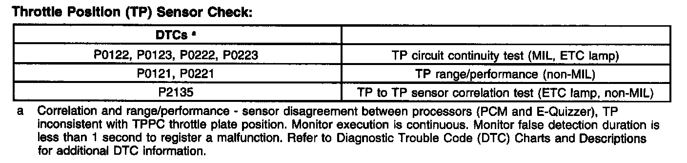 6. The throttle position (TP) sensor has 2 signal circuits in the sensor for redundancy. The redundant throttle position signals are required for increased monitoring reasons. The first TP signal (TP1) has a negative slope (increasing angle, decreasing voltage) and the second signal (TP2) has a positive slope (increasing angle, increasing voltage). During normal operation the negative slope TP signal (TP1) is used by the control strategy as the indication of throttle position. The TP sensor assembly requires 4 circuits.