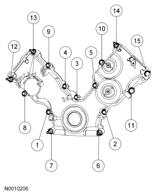 - Tighten the engine front cover fasteners in 2 stages, in the sequence shown in Fig 3.