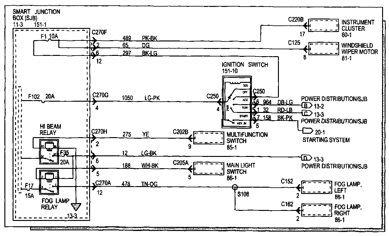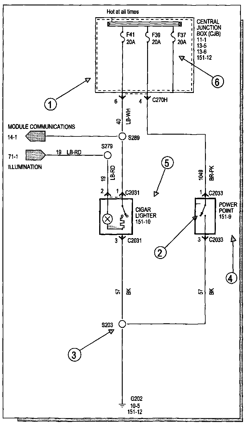 Each set normally starts with the component that powers the circuit, such as a fuse or the ignition switch. Current flow is shown from the power source at the top of the diagram to ground at the bottom of the diagram. A full representation of the power supply of a fuse or the power distribution from a fuse to various components is given in the Power and Ground Distribution Diagrams. Full representation of the ground connections are shown in the Power and Ground Distribution Diagrams.