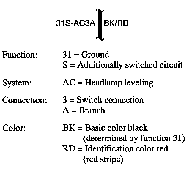 Each function code has a specific basic color associated with it, which can also be seen in the chart of function codes on the next diagram. The identification color is a colored stripe used to differentiate several wires with the same function within one component connector.