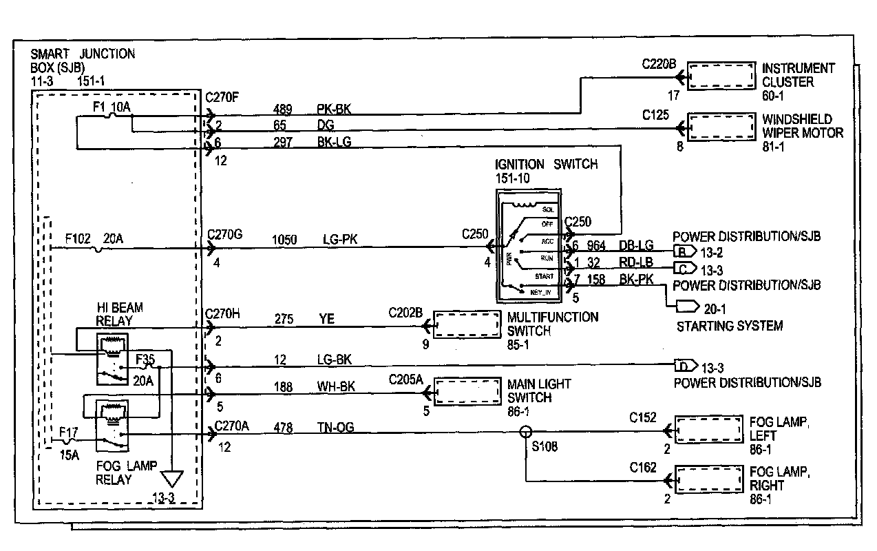 Each set normally starts with the component that powers the circuit, such as a fuse or the ignition switch. Current flow is shown from the power source at the top of the diagram to ground at the bottom of the diagram. In order to concentrate on the essential parts, power supply and ground connections are sometimes simplified by a dashed line in the diagrams. A full representation of the power supply of a fuse or the power distribution from a fuse to various components is given in the Power and Ground Distribution Diagrams. Full representation of the ground connections is shown in the Power and Ground Distribution Diagrams.