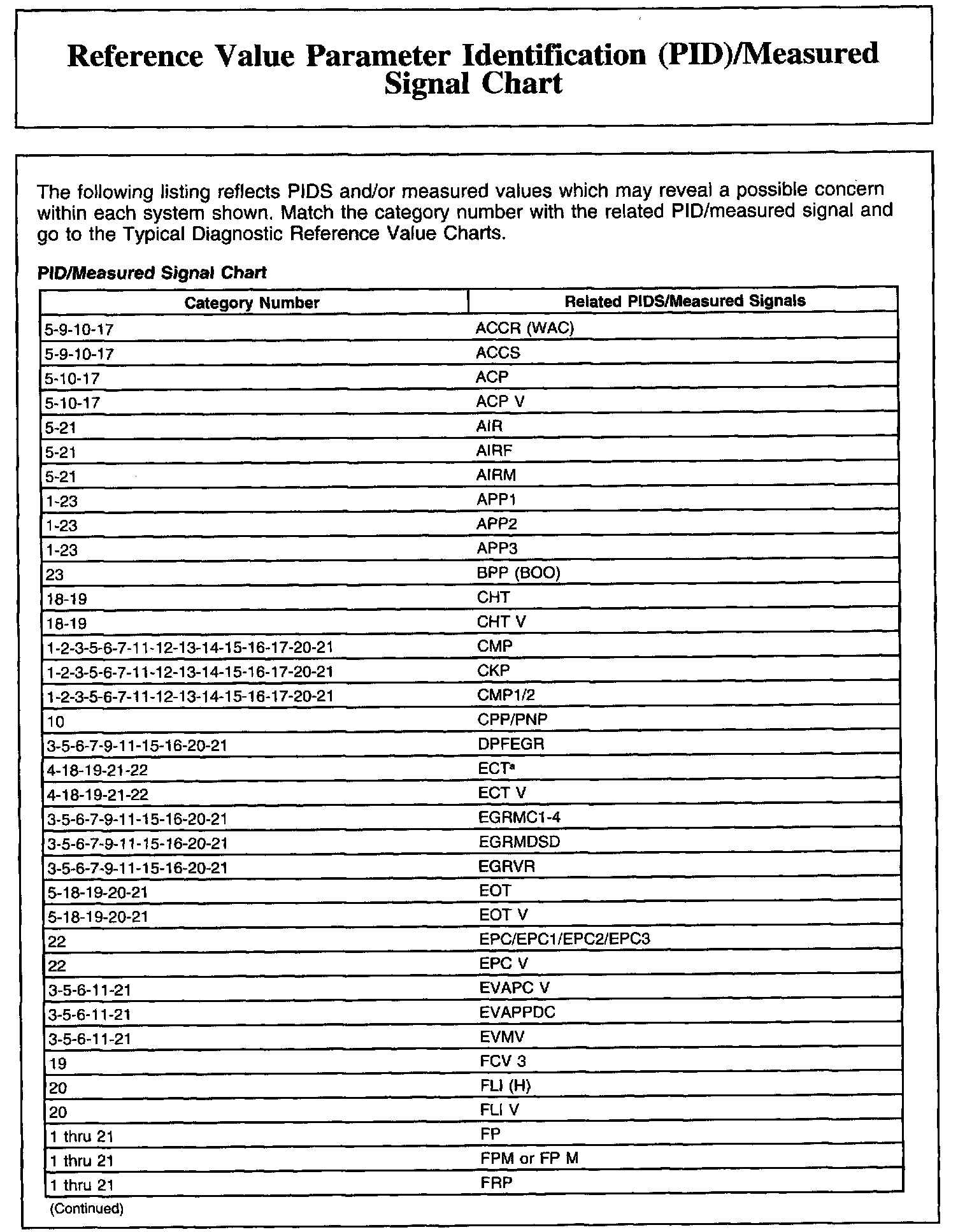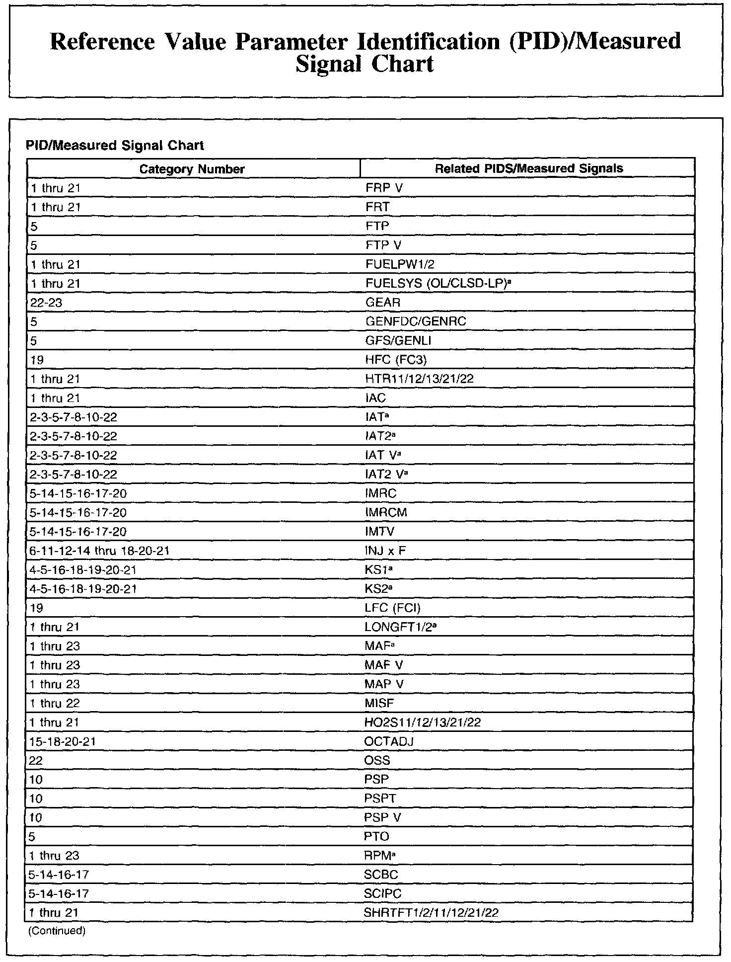 Reference Value Parameter Identification (PID)/Measured Signal Chart (Part 2):