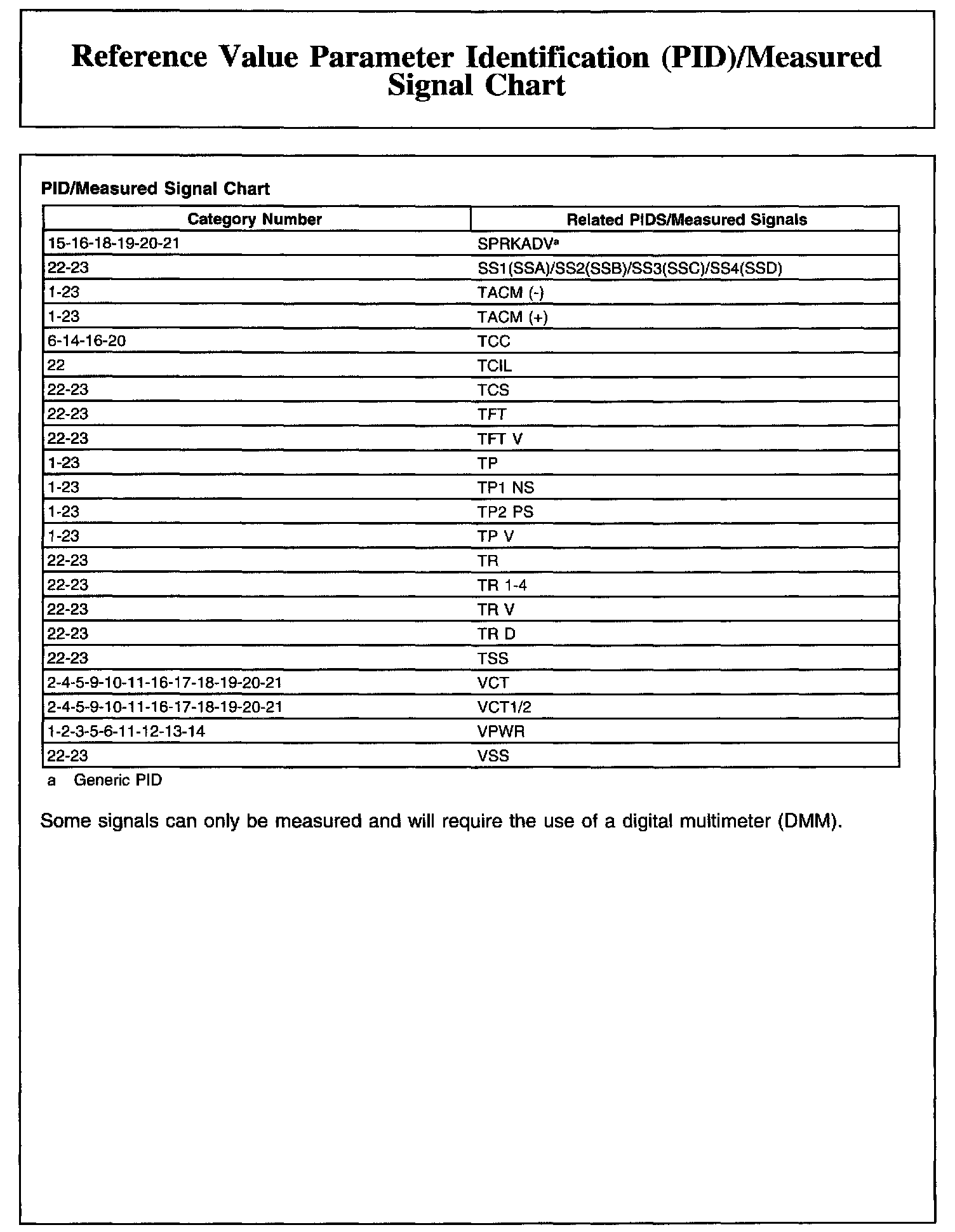 Reference Value Parameter Identification (PID)/Measured Signal Chart (Part 1):