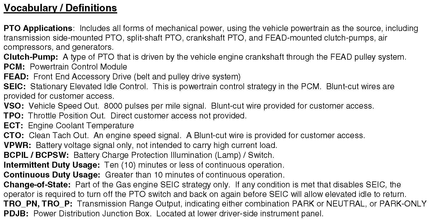 PTO Control (For automatic transmission-mounted PTO only): This is PCM strategy within the SEIC feature that automatically looks for and recognizes whether the vehicle has a TorqShift automatic transmission with a side- mount PTO ("Transmission PTO Provision", Option Code 62R), and makes the internal PTO gear function by commanding the torque converter to lock at 1200 rpm minimum speed. The PTO gear is splined directly to the transmission torque converter turbine shaft. When all of the vehicle safety enablers are met, and the engine speed is commanded by the operator to at least 1200 rpm, then the strategy automatically commands the torque converter to lock at 1200 rpm to deliver engine torque to the PTO gear (actual lock-up begins at approximately 1050 rpm), and elevates the transmission hydraulic line pressure to 150 psi nominal for the aftermarket PTO to use to hold its engagement clutch. NOTE: Applying battery voltage to the Diesel "PTO" or Gas "PTO-Mode" wires is required to initiate these commands. Failing to do so may show up as low or oscillating hydraulic line pressure and low or no aftermarket PTO torque or pump flow output. Any attempt to operate the aftermarket PTO at elevated idle without these commands may result in under-capacity PTO clutch wear, resulting in rapid contamination of transmission fluid and internal transmission damage. This applies to both stationary - mobile automatic transmission PTO operations.