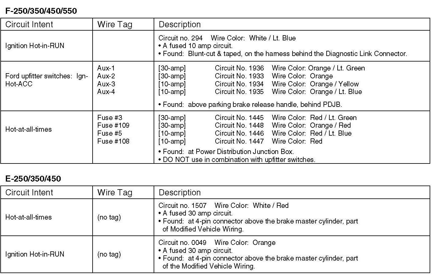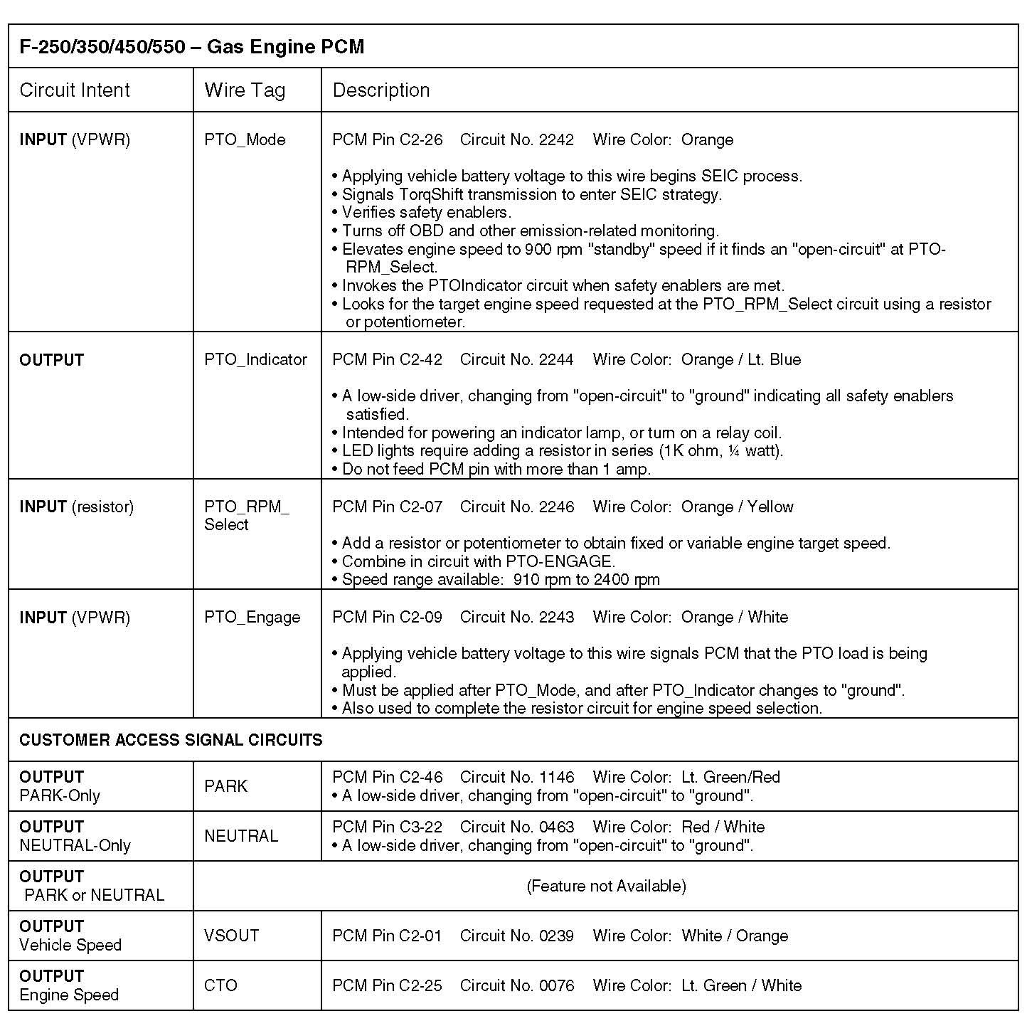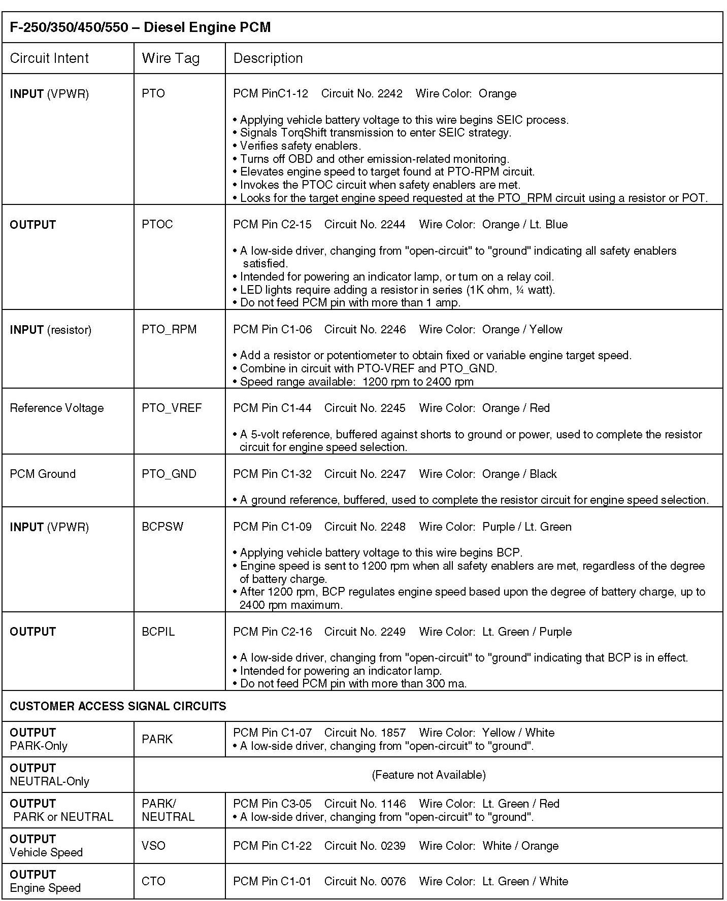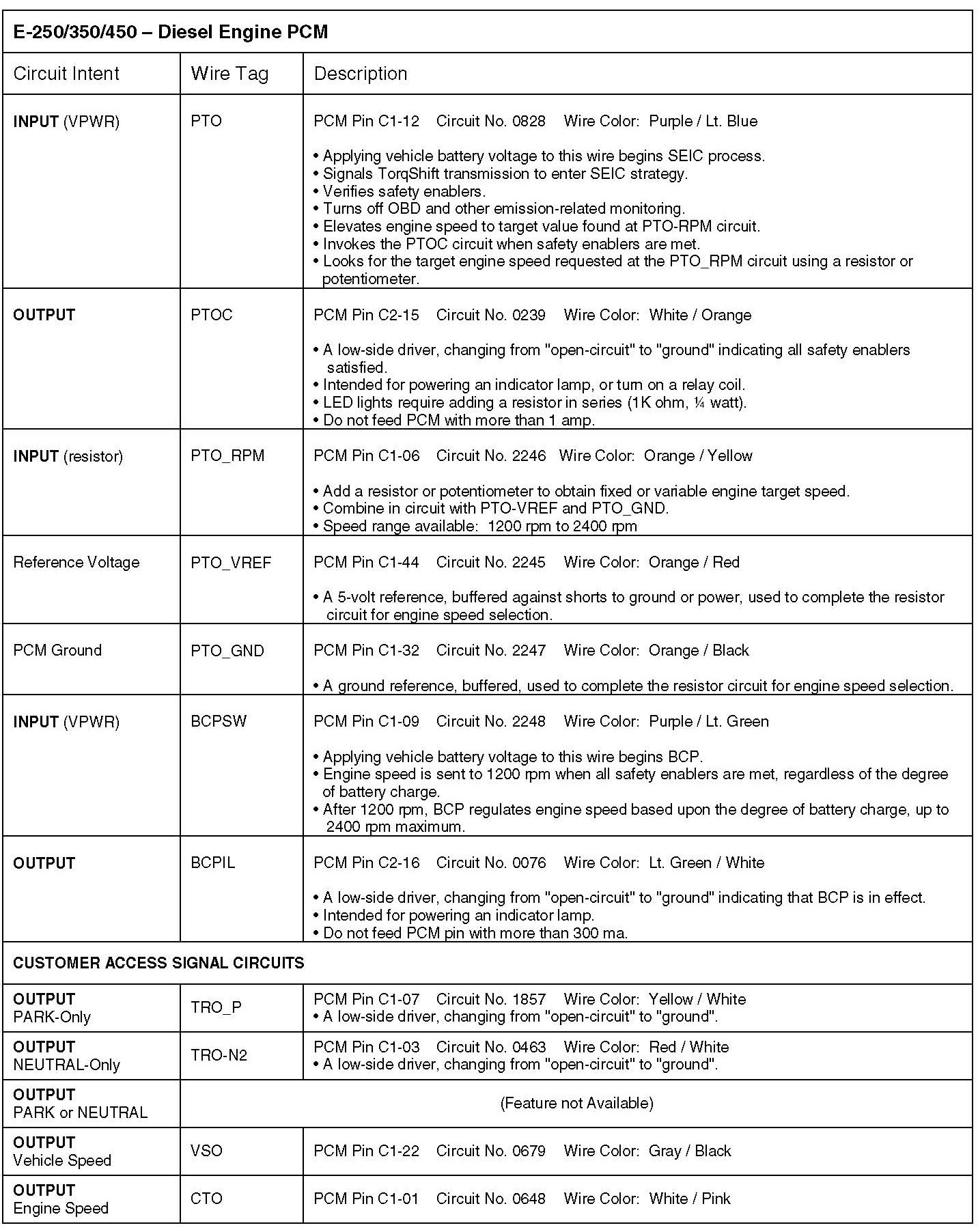 SEIC (Stationary Elevated Idle Control): New for 2005 model year, this feature is included in the powerirain control strategy of all F250/350/450/550 and E250/350/450, over-8500 lb GVWR, all powerirains. For diesel engines it replaces the APCM (Auxiliary Powerirain Control Module) previously included with Ford "Auxiliary Idle Control Kit" Option Codes 96P (F-Series) and 961 (E-Series). For a stationary vehicle it allows the operator to elevate engine idle speed to operate a transmission-mounted PTO, or engine FEAD-mounted clutch-pump, air compressor, or generator; or be used to help keep the vehicle battery charged. SEIC uses CAN messaging internally. It is activated by applying discrete voltage signals to a wire bundle located in the F-Series cabin above the parking brake release handle, and in the E-Series engine compartment. The up-fitter will need to complete the circuits as described herein, and provide the customer interiace (i.e. buttons, LCD read-out for engine speed, PlO switch, etc.). Note: The F-Super Duty light truck offers four optional relayed rocker switches on the instrument panel for the up-fitter to use (Option Code 66S). Ramp-up rate is fixed and approximately 200 rpm/sec for diesel engine and 400 rpm/sec for gas engine.
