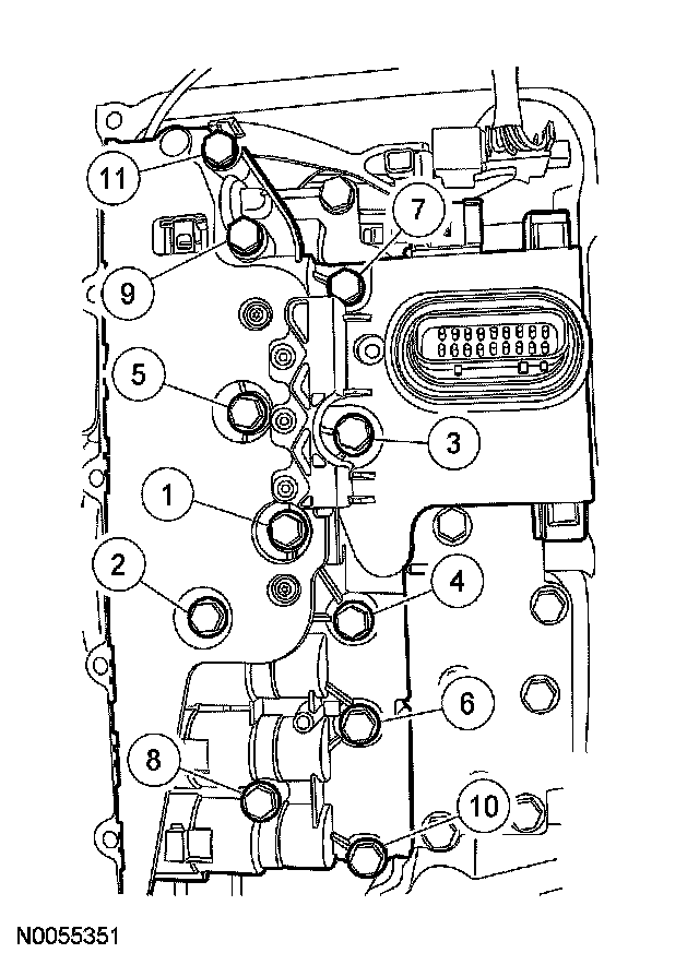 Position the TSS, OSS and TR sensor wiring harnesses aside and install the main control valve body, the TR sensor detent spring and the 10 bolts. Tighten the bolts in the sequence shown.