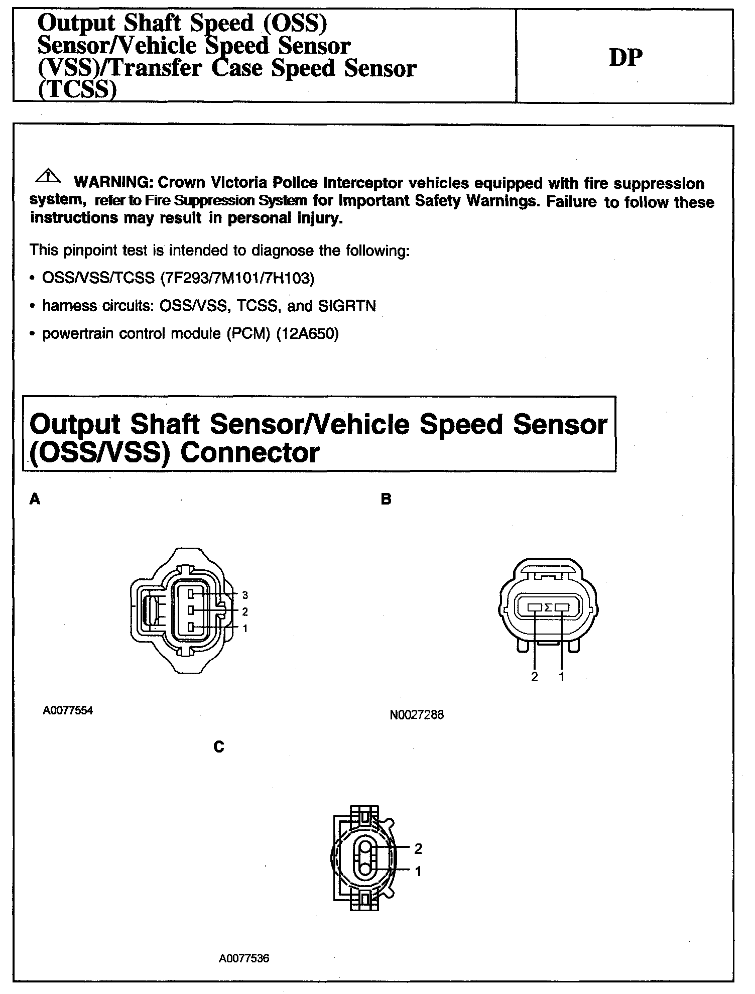 Home >> Ford >> 2007 >> Escape 2WD L4-2.3L VIN Z >> Repair and Diagnosis >> Powertrain Management >> Computers and Control Systems >> Testing and Inspection >> Pinpoint Tests >> Tests DP: Output Shaft Speed (OSS) Sensor/Vehicle Speed Sensor (VSS)/Transfer Case Speed Sensor (TCSS)