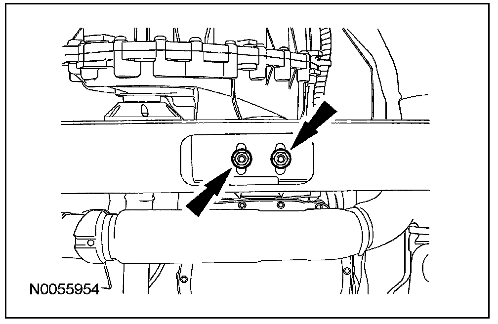 3. Remove the LH and RH exhaust heat shield-to-crossmember fasteners.