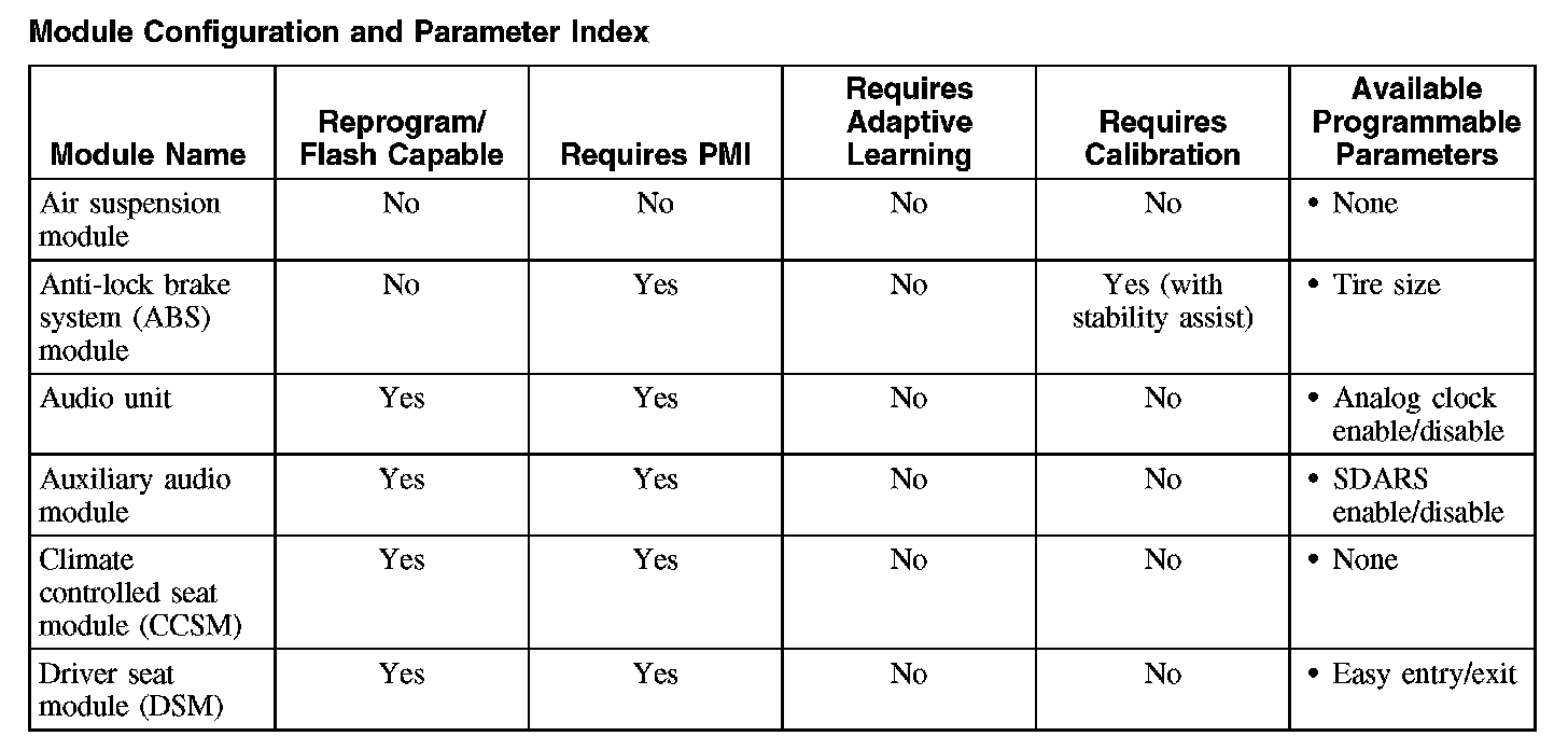 Programmable parameters are customer preference items that may be modified by the dealer via scan tool or in some cases modified by the customer following a procedure listed in the vehicle Owner's Literature. While many configuration options may exist for a module, only a few of these options are programmable parameters.