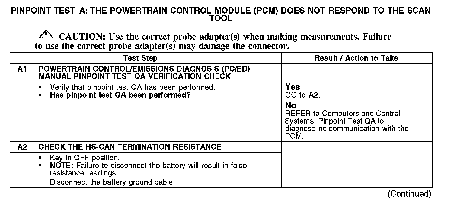 PINPOINT TEST A: THE POWERTRAIN CONTROL MODULE (PCM) DOES NOT RESPOND TO THE SCAN TOOLA1-A2: