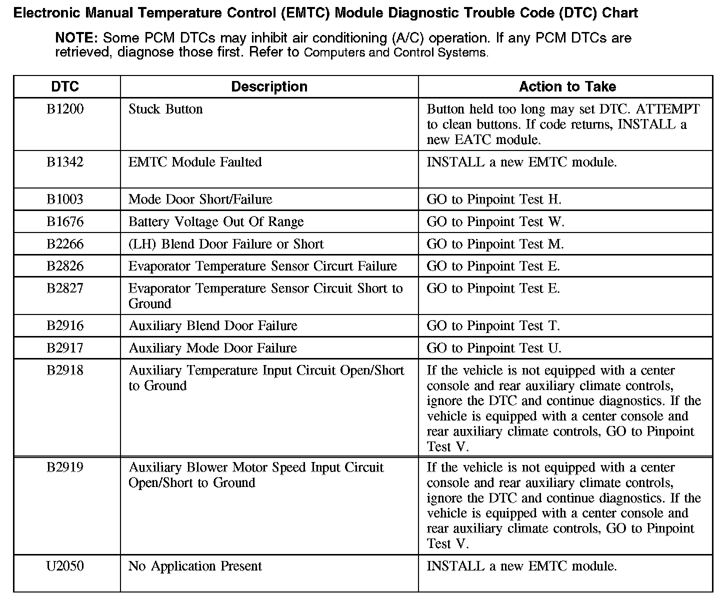 Electronic Manual Temperature Control (EMTC) Module Diagnostic Trouble Code (DTC) Chart