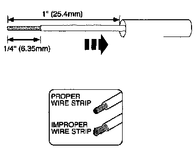 2. Strip 1/4" (6.35mm) of insulation from each wire end, taking care not to nick or cut wire strands.