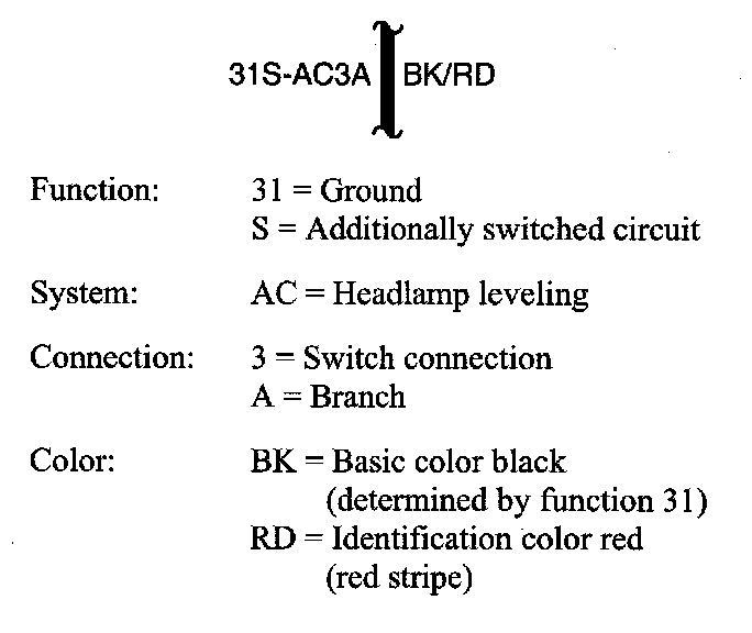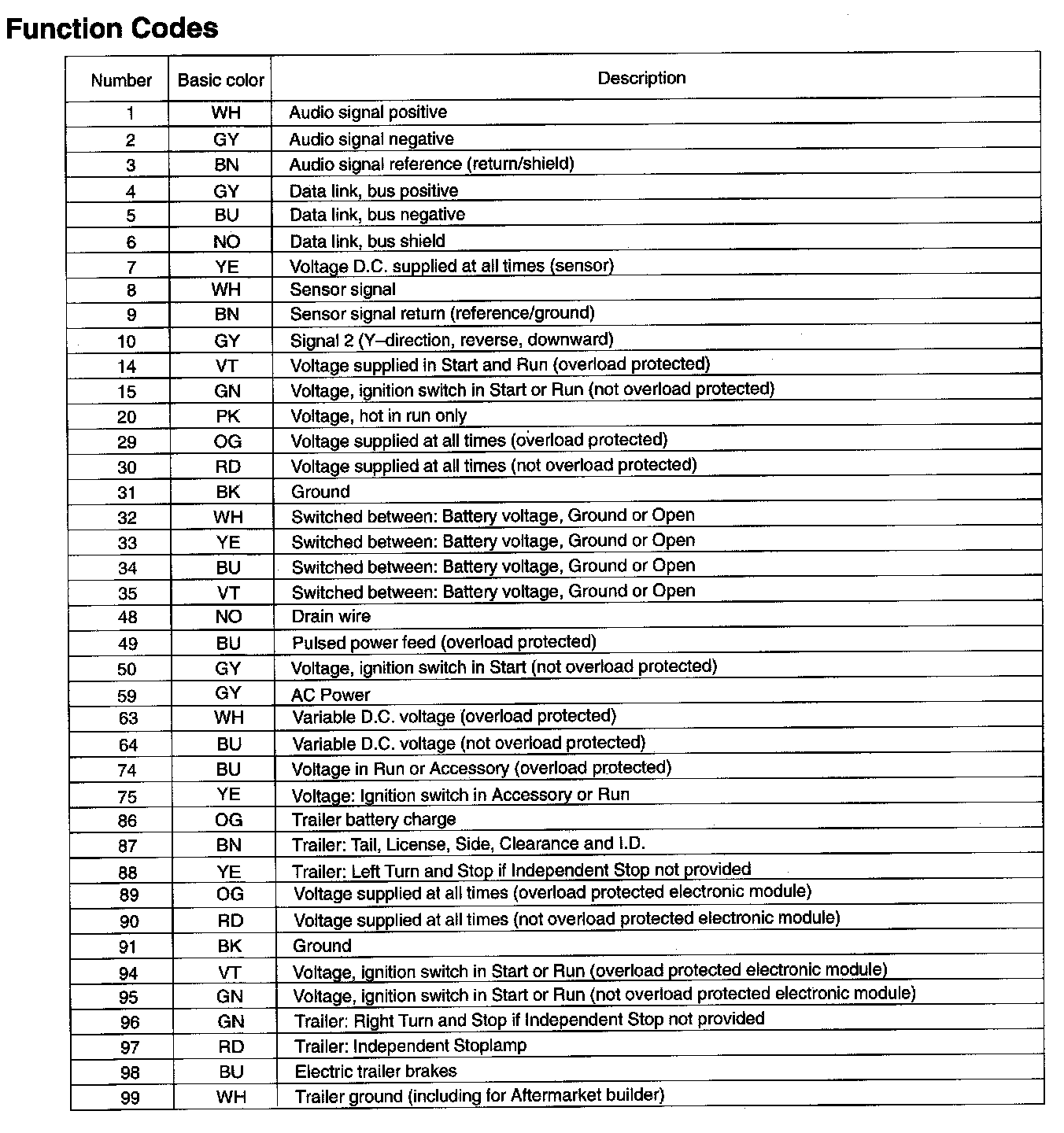 Each function code has a specific basic color associated with it, which can also be seen in the chart of function codes on the next diagram. The identification color is a colored stripe used to differentiate several wires with the same function within one component connector.