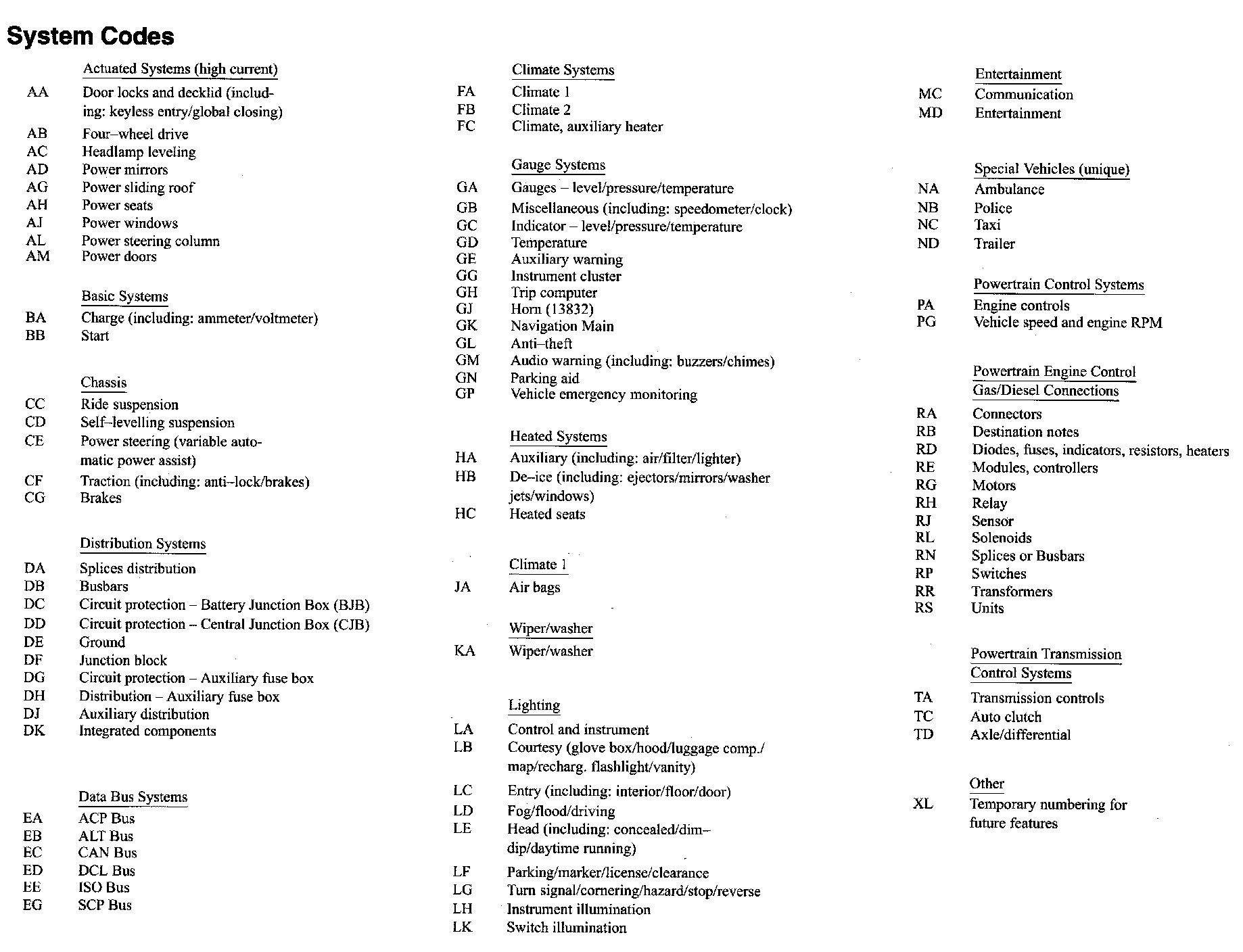 Systems are related to subsets of the vehicle circuitry. A complete list of the system codes can be found on diagram 3-8.