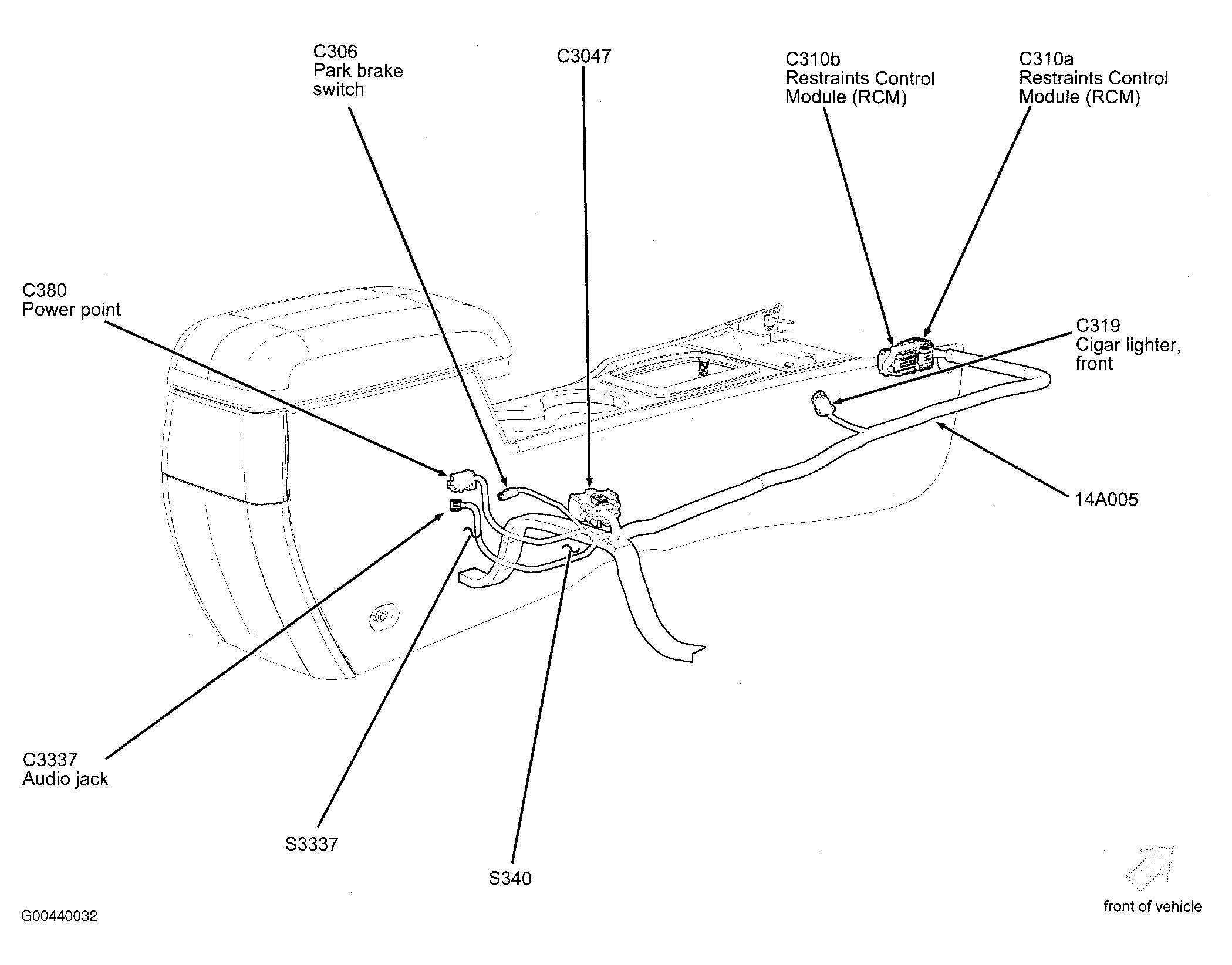 | Restraints Control Module (RCM) | Under center console. See Figure. |