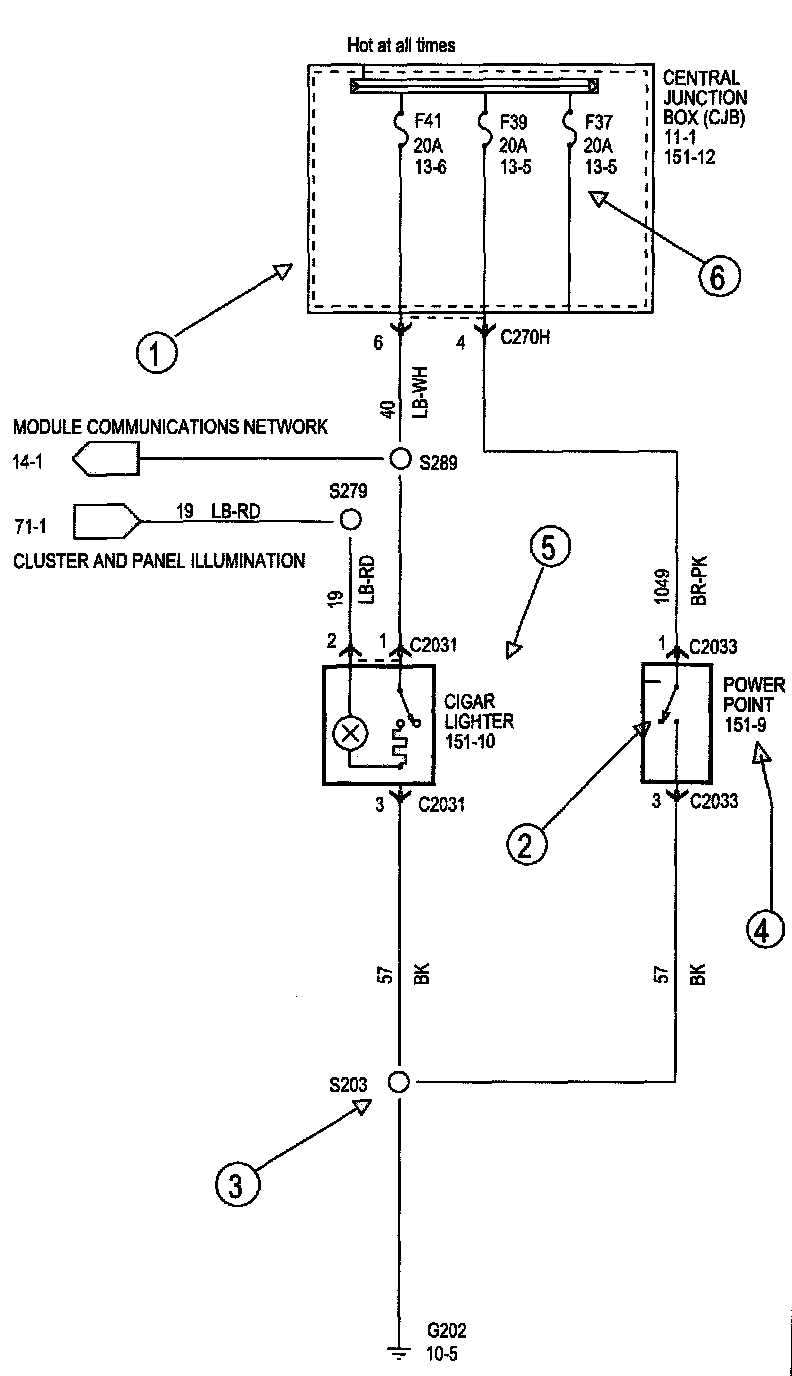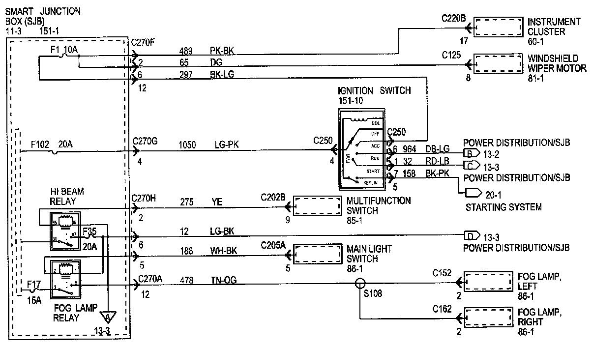 Each set normally starts with the component that powers the circuit, such as a fuse or the ignition switch. Current flow is shown from the power source at the top of the diagram to ground at the bottom of the diagram. A full representation of the power supply of a fuse or the power distribution from a fuse to various components is given in Power and Ground Distribution Diagrams. Full representation of the ground connections are shown in Power and Distribution Diagrams.