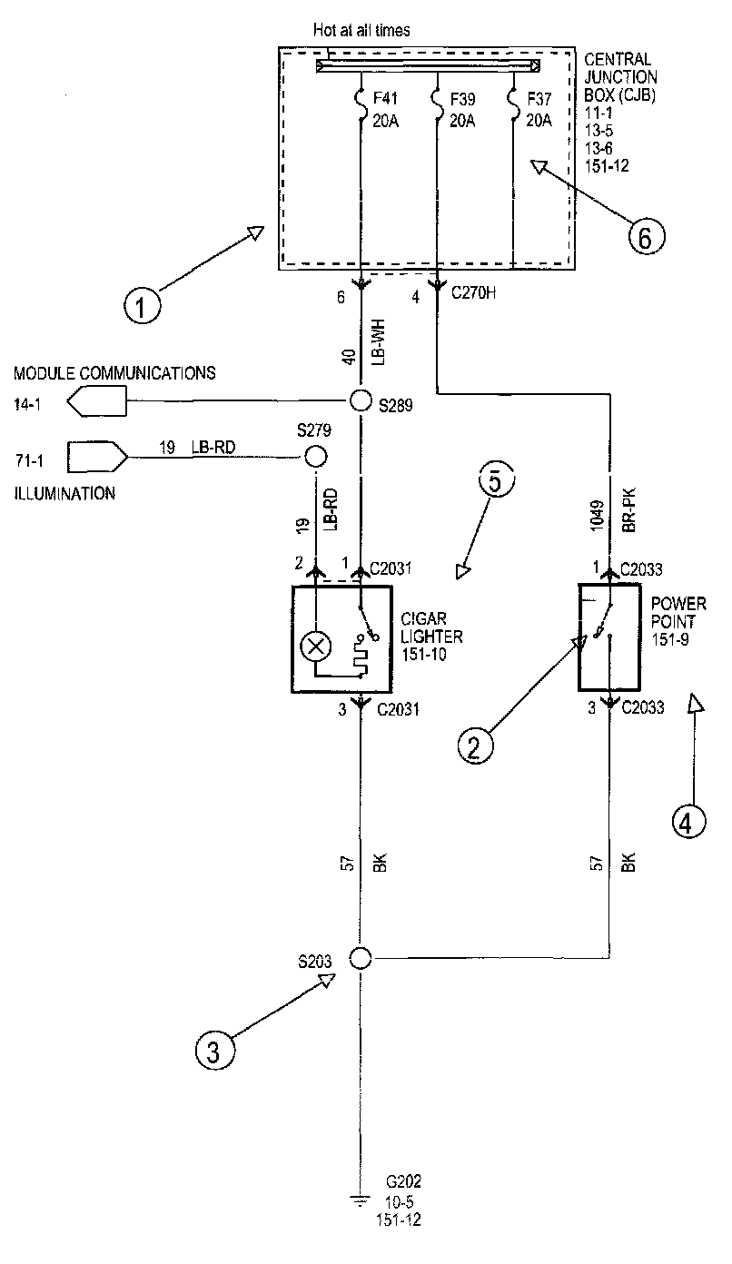 Each set normally starts with the component that powers the circuit, such as a fuse or the ignition switch. Current flow is shown from the power source at the top of the diagram to ground at the bottom of the diagram. A full representation of the power supply of a fuse or the power distribution from a fuse to various components is given in Power and Ground Distribution Diagrams. Full representation of the ground connections are shown in Power and Distribution Diagrams.
