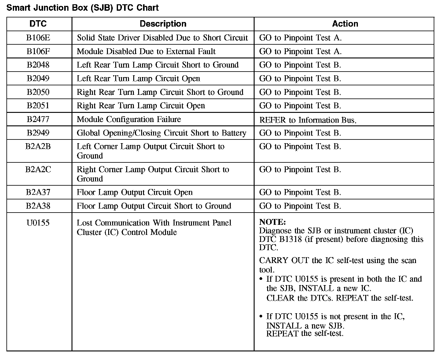 Smart Junction Box (SJB) DTC Chart
