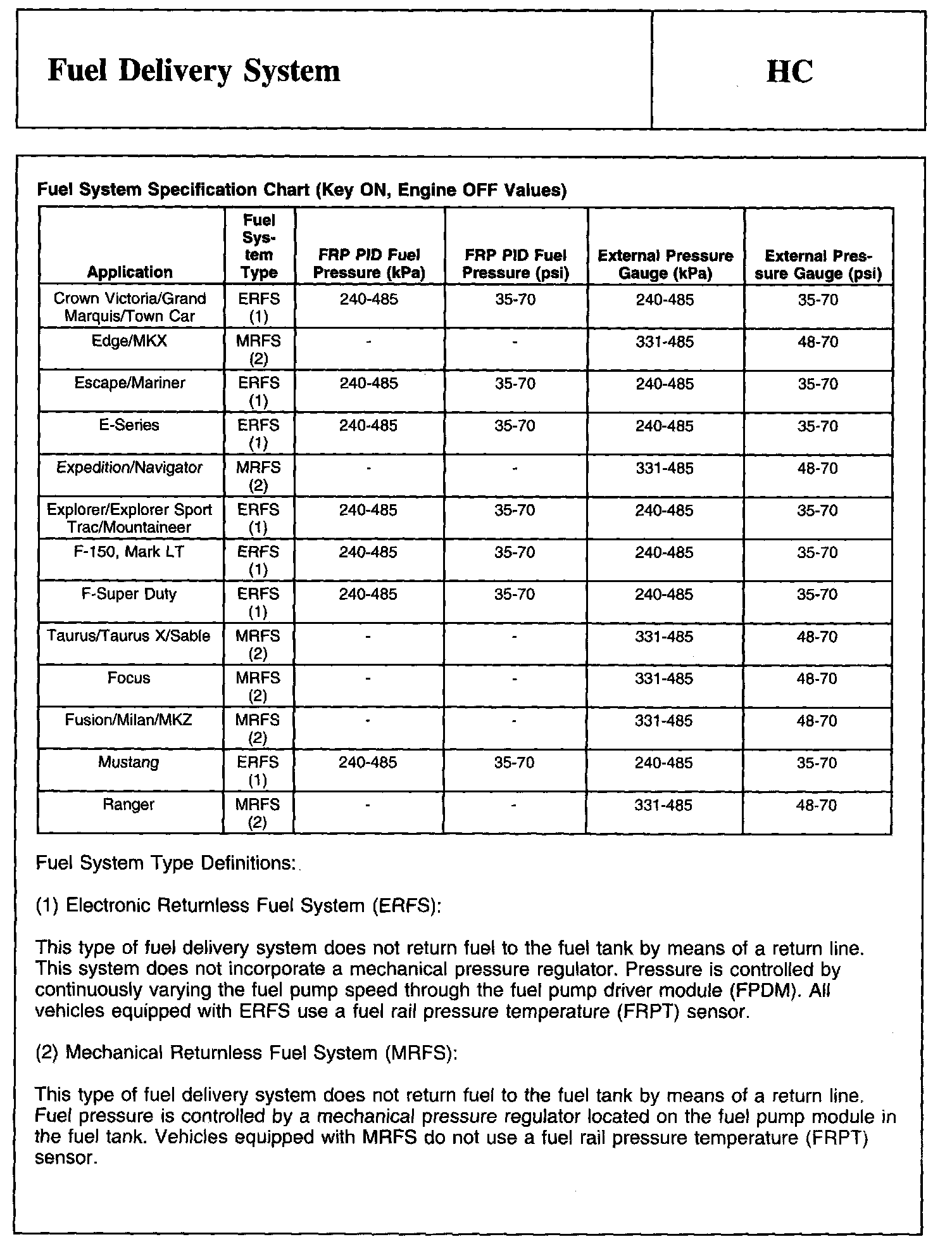 Fuel System Specification Chart (Key On, Engine Off Values):