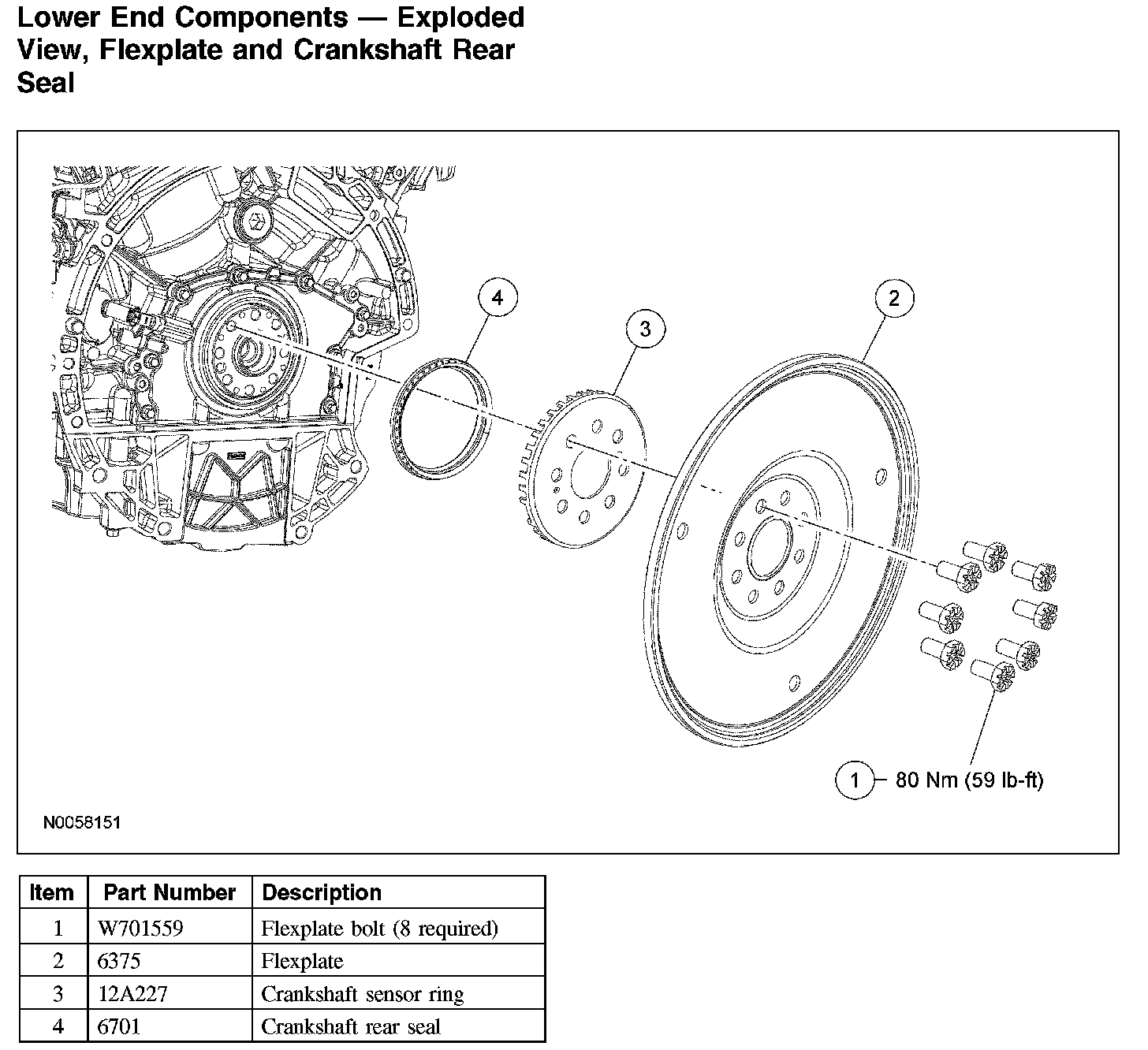 Lower End Components - Exploded View, Flexplate and Crankshaft Rear Seal