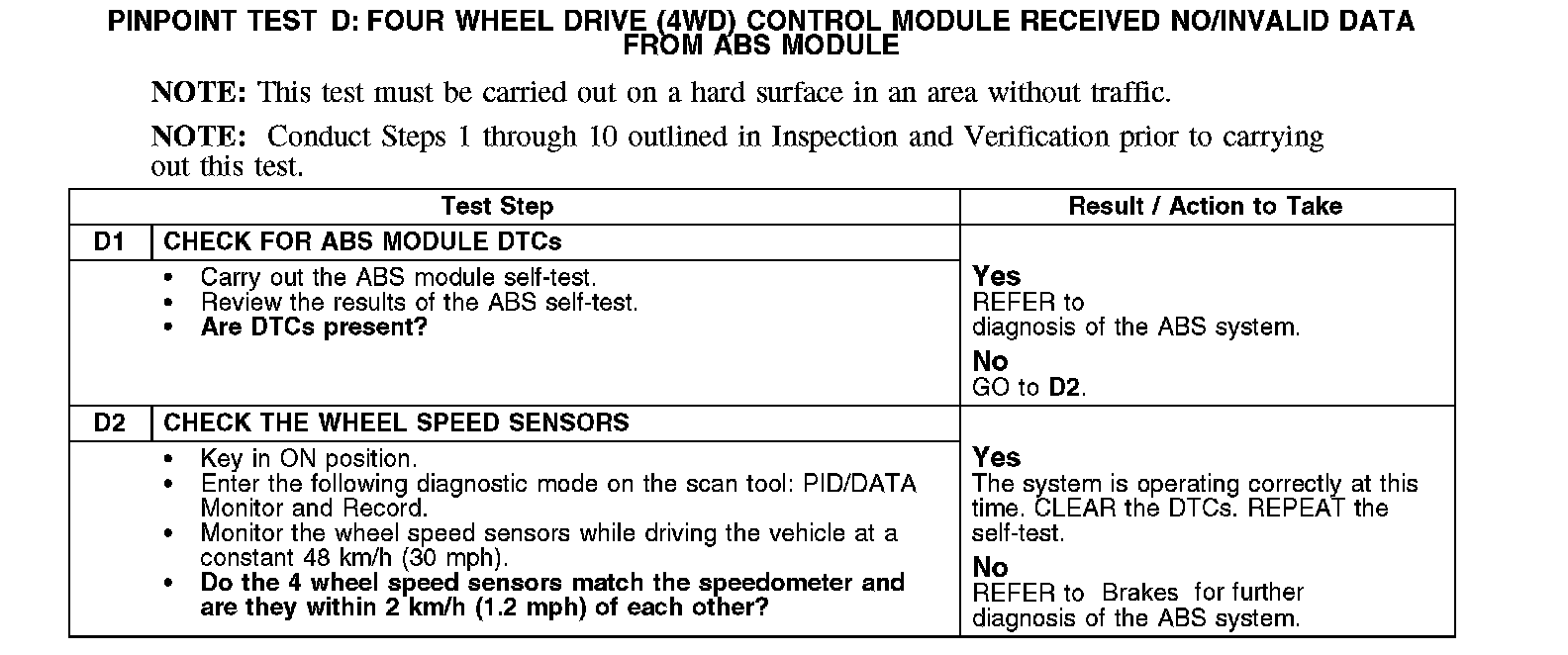 Pinpoint Test D: Four Wheel Drive (4WD) Control Module Received No/invalid Data from ABS Module