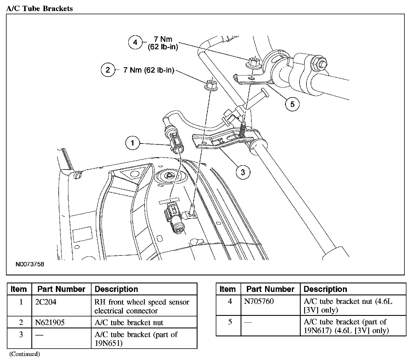 3. Disconnect the RH front wheel speed sensor electrical connector. Remove the nut(s) and position the A/C tube bracket(s) and wiring harness aside.