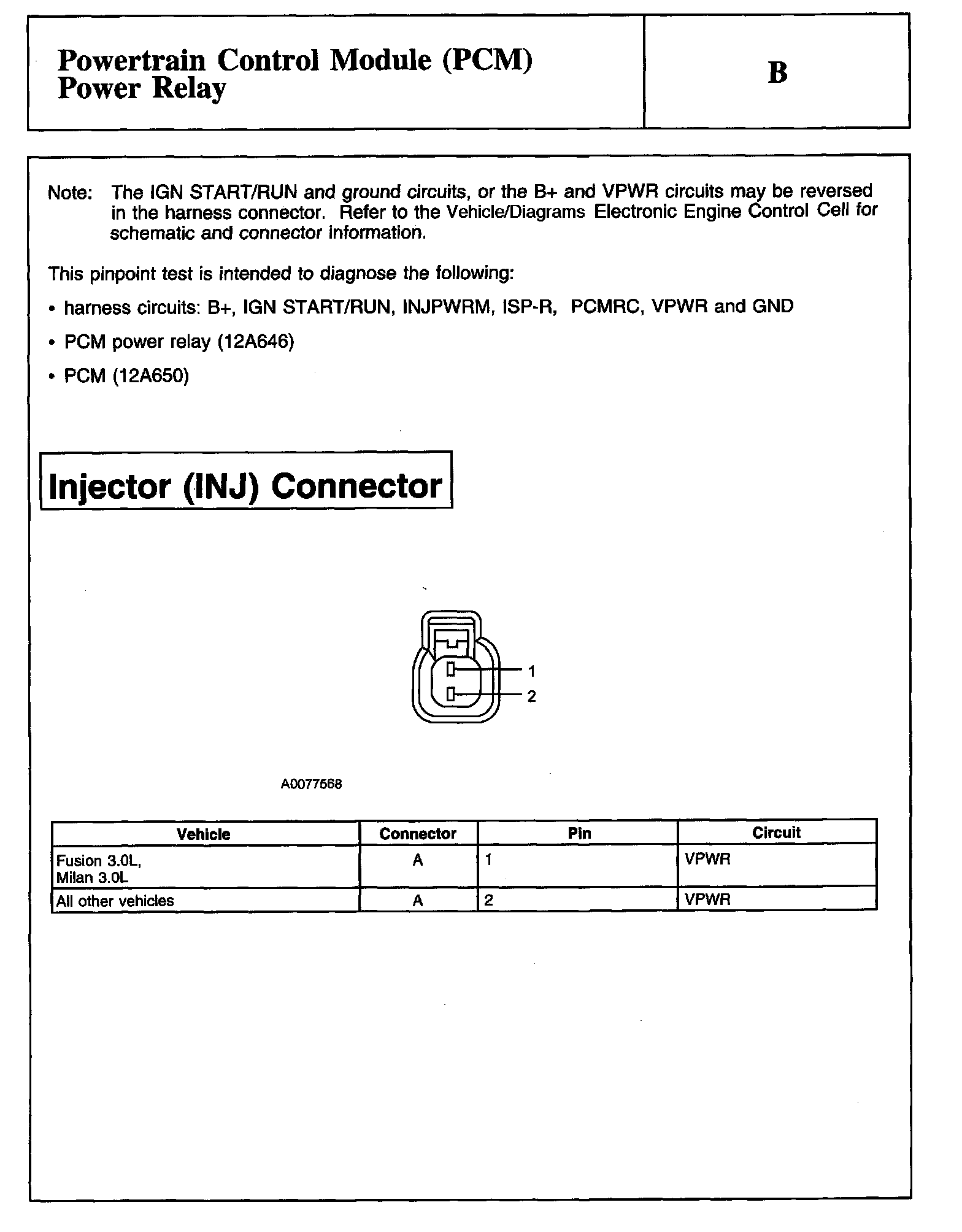 PINPOINT TEST B: POWERTRAIN CONTROL MODULE (PCM) POWER RELAYNote And Injector (INJ) Connector: