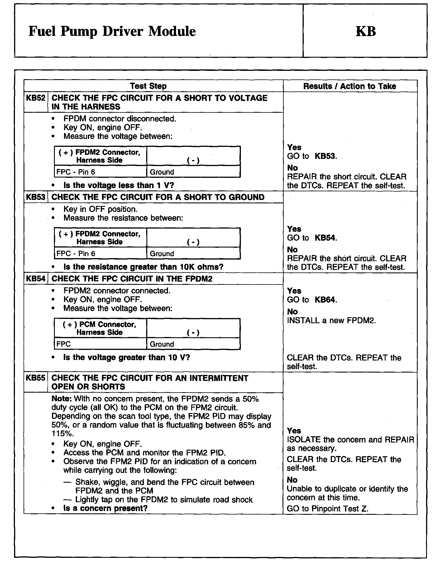 Home >> Ford >> 2008 >> Explorer 2WD V8-4.6L >> Repair and Diagnosis >> Powertrain Management >> Computers and Control Systems >> Testing and Inspection >> Pinpoint Tests >> Tests KB: Fuel Pump Driver Module