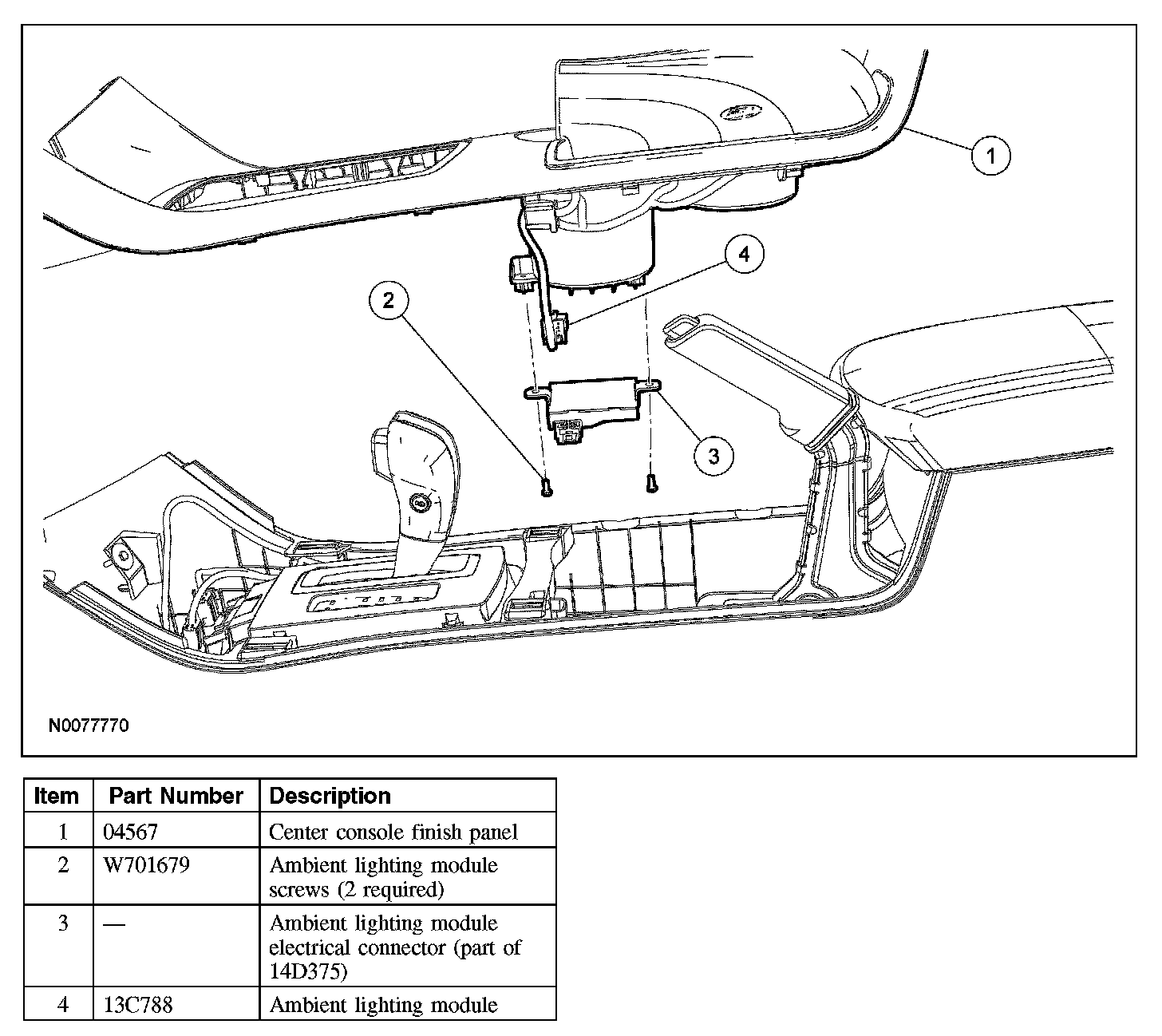 2. NOTE: The ambient lighting module is mounted under the bottom of the floor console finish panel cup holder.
